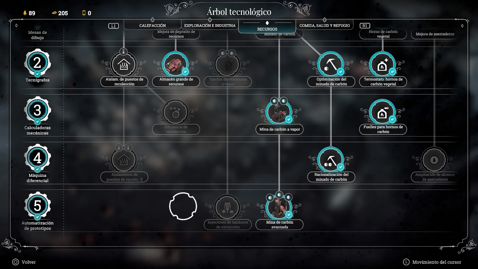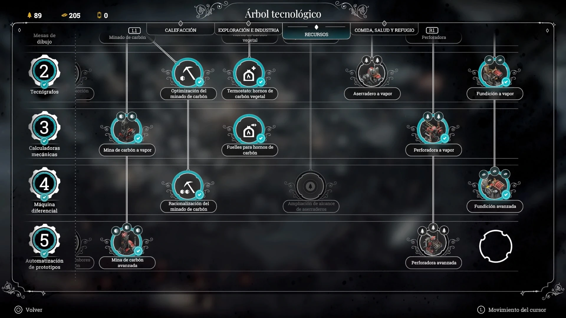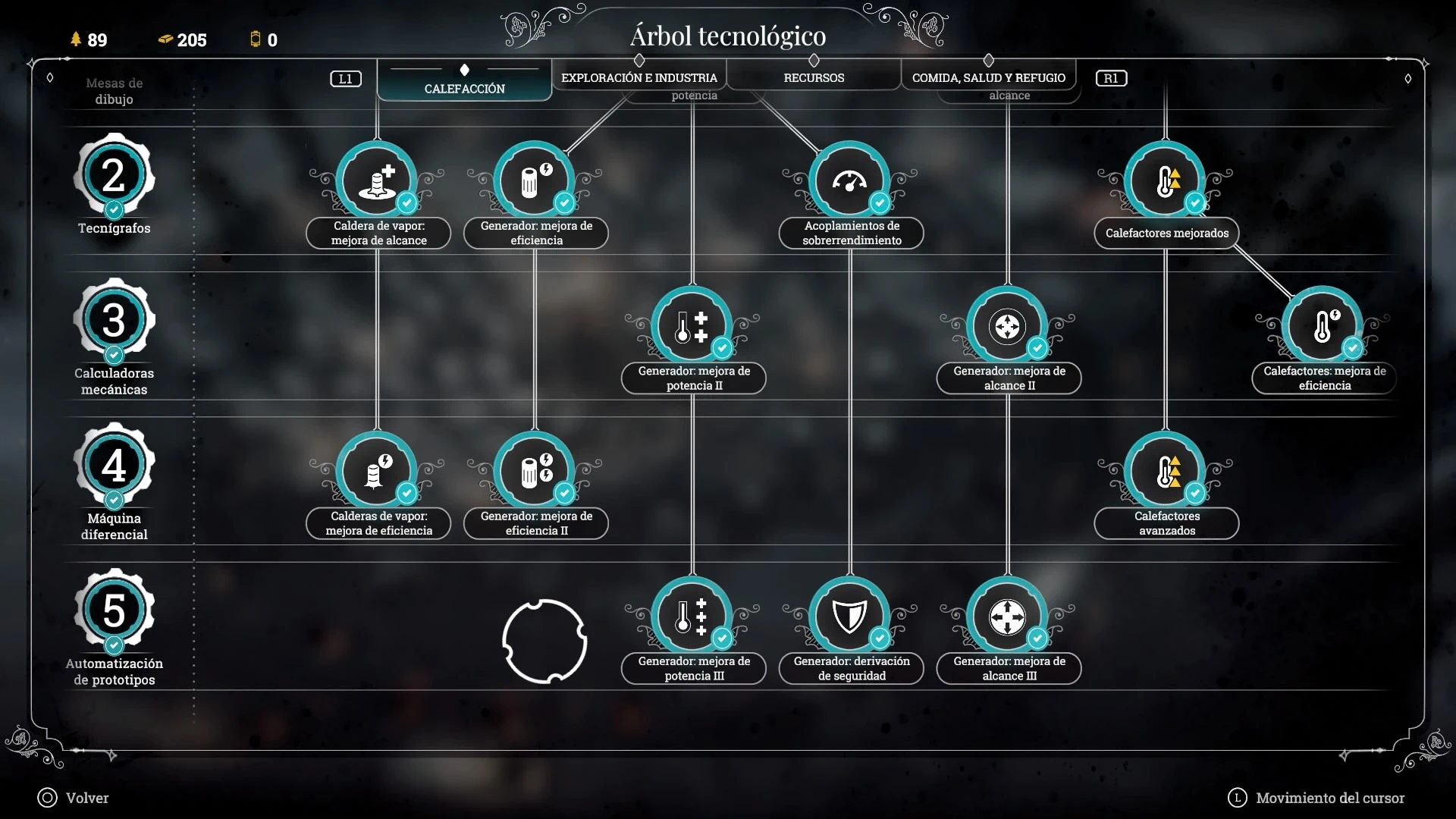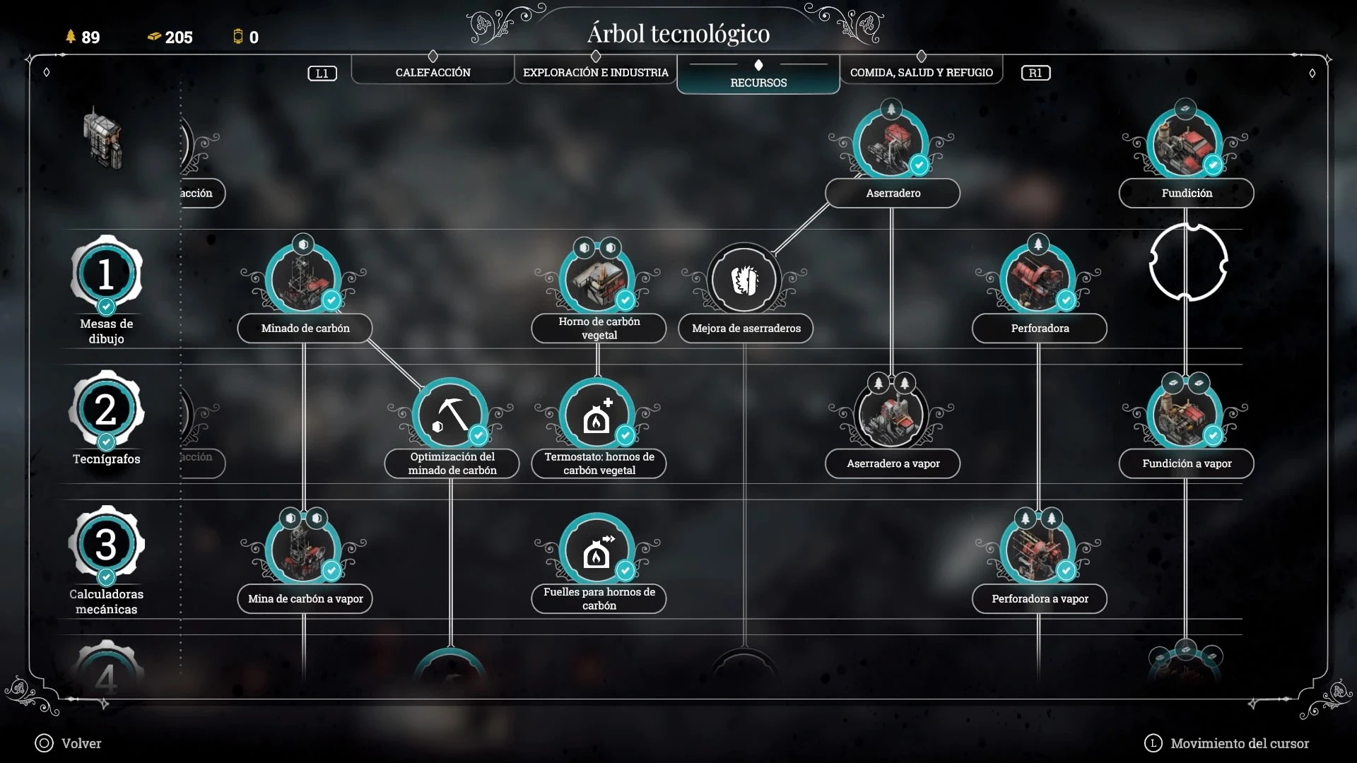 El otro árbol de desarrollo son las investigaciones proporcionadas por los talleres. Estos proporciona mejoras tecnológicas de caza, de poder construir nuevos edificios, avances para hacer más eficientes a los trabajadores, minas, construir autómatas o mejorar el generador. Inicialmente las más interesantes serán las dedicadas conseguir recursos. Los avances tecnológicos se dividen en niveles, no hace falta desarrollar todos los de un nivel siguiente pero cada nivel ha de ser investigado para tener acceso él.