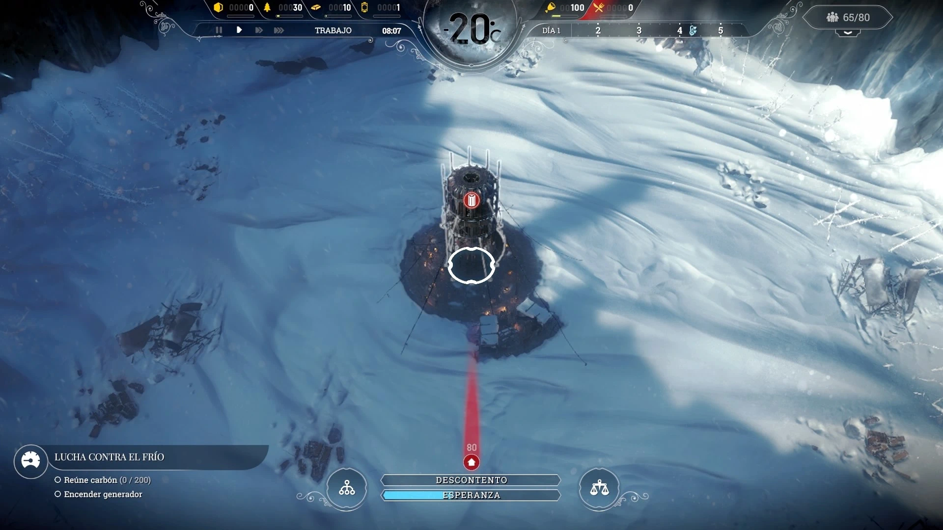 Frostpunk es un juego de gestión de recursos en el que hay que ser previsor a las necesidades futuras para no malgastar tiempo esperando a tener los recursos necesarios. Hay que construir edificios por adelantado antes de que sean imprescindibles o acumular recursos para acometer la siguiente investigación en cuanto se pueda. De forma regular es aconsejable realizar guardados para poder volver a un punto anterior para poder reconducir la partida tomando otras decisiones.