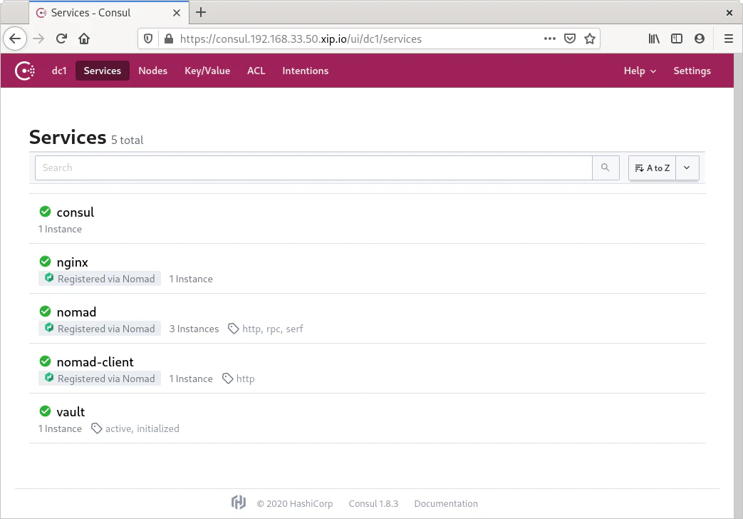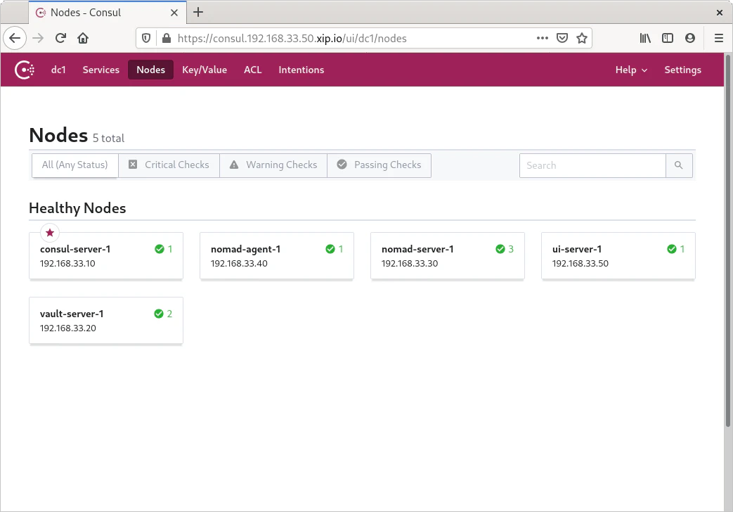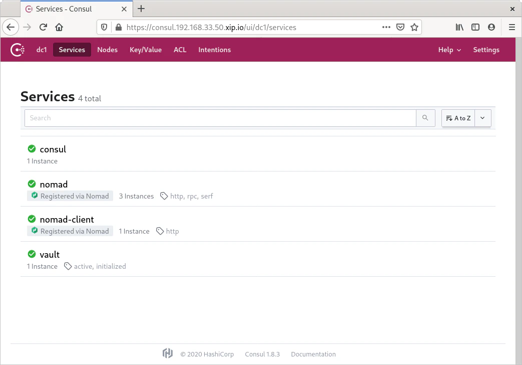 Las consolas de administración web de Consul, Vault y Nomad están accesibles en estas direcciones URL que están protegidas por una autenticación básica, dado que el certificado de la CA no es de confianza para el navegador se muestra previamente un mensaje de advertencia. En la consola web de Consul se observan los servicios y nodos registrados registrados y su estado de salud.