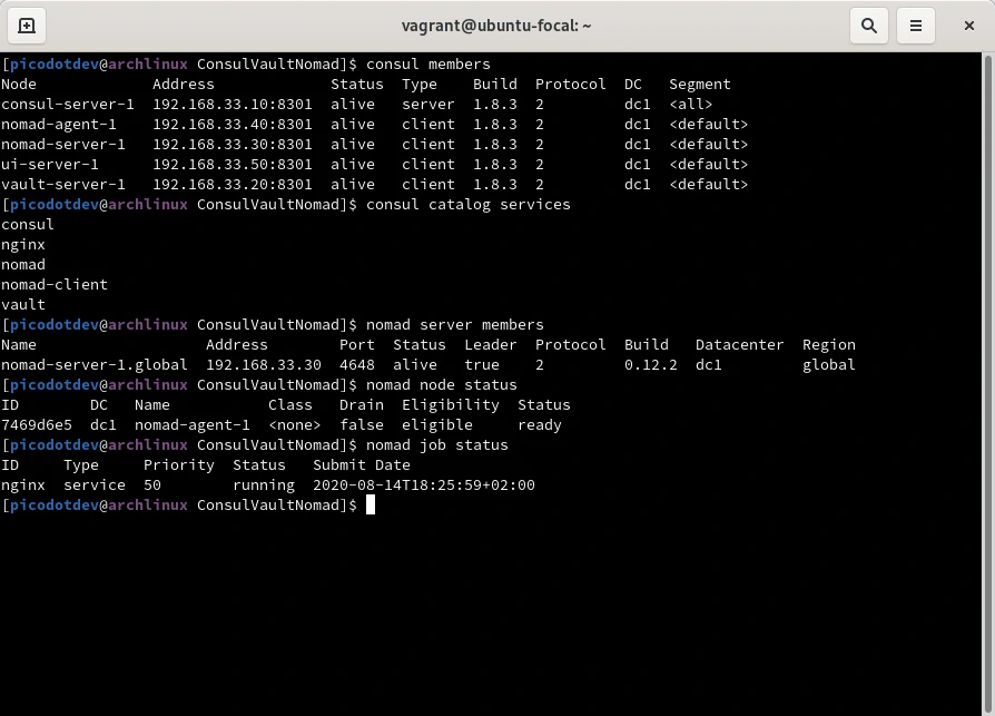 En este artículo muestro un ejemplo usando tres de estos mismos productos que se usarían en un entorno de producción Consul para el registro de servicios y conexión de forma segura, Vault para seguridad y servicios de cifrado y Nomad para la ejecución de servicios con contenedores Docker. Para el aprovisionamiento y ejecutar el ejemplo en la propia máquina el ejemplo usa Vagrant que permite crear y aprovisionar máquinas virtuales sobre VirtualBox, en un entorno basado en la nube se usaría Terraform. Consul, Vault y Nomad forman lo que sería un centro de datos de un entorno de ejecución para aplicaciones y servicios.