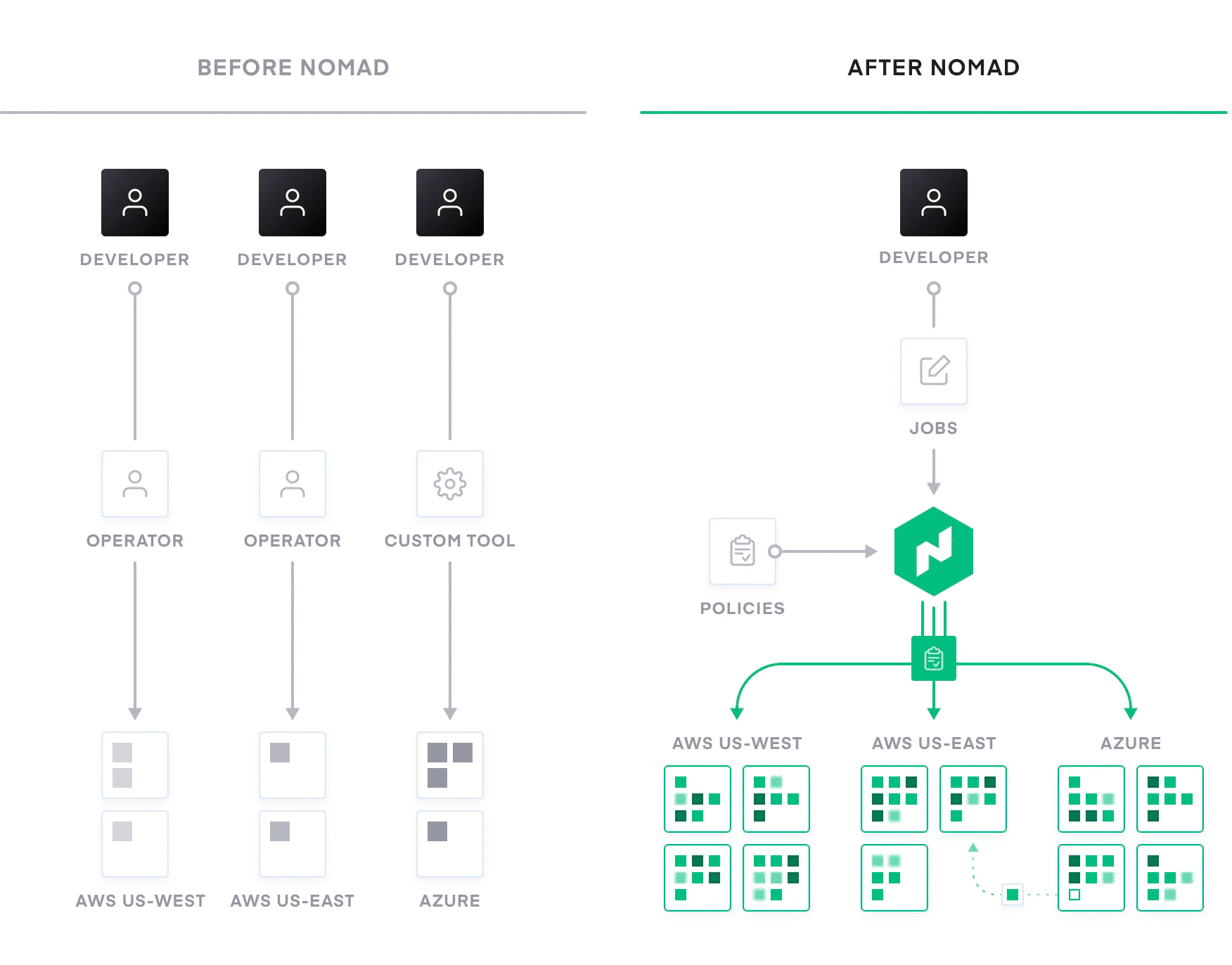 HashiCorp proporciona la mayoría de las funcionalidades de Kubernetes en cada una de las diferentes herramientas que tiene siguiendo la filosofía Unix de herramientas con un ámbito reducido y agregables, por ejemplo, Consul proporciona descubrimiento de servicios, Vault seguridad y Nomad está diseñado específicamente para proporcionar gestión del cluster y planificación.