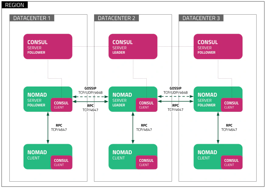 La arquitectura de las herramientas de HashiCorp es más simple, cada una de las herramientas es un único binario que sirve tanto para actuar como servidor como cliente y que se pueden utilizar sin requerir al resto, tanto es así que Consul se puede utilizar y algunos lo utilizan junto a Kubernetes. Los servidores son distribuidos, con alta disponibilidad y operacionalmente más fáciles. Los servidores soportan configuraciones multicentro de datos y multiregión llegando a tamaños que superan los 10K nodos en entornos de producción.