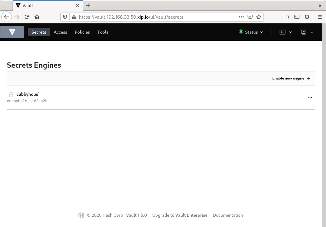 - Dirección, usuario y contraseña de consola web Vault: https://vault.192.168.33.50.xip.io, vault y vault.