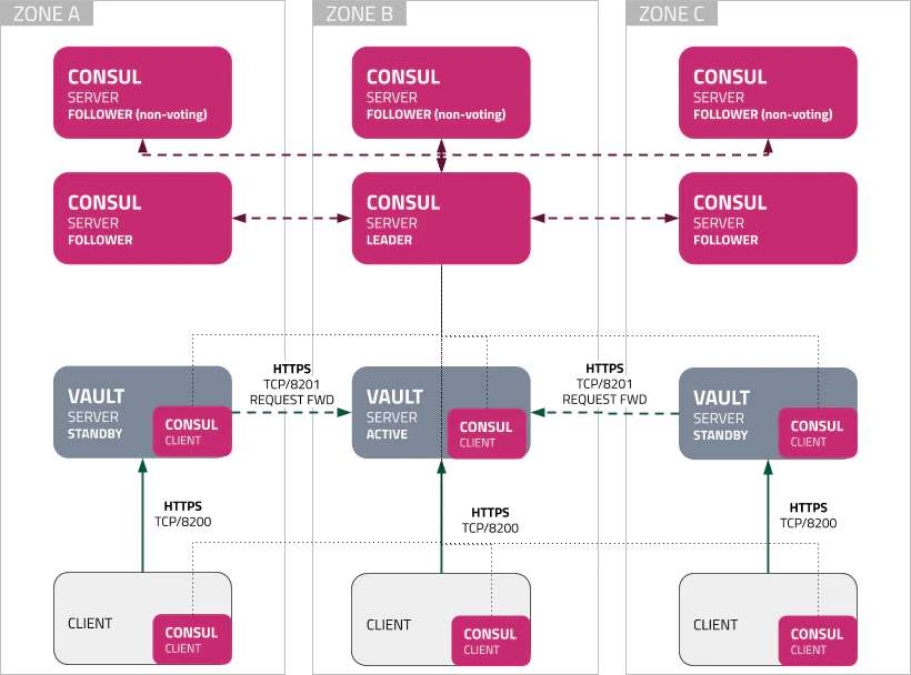 La comunicación entre Consul, Vault y Nomad se realiza utilizando diferentes protocolos y puertos de red, el entorno de computación como el que proporcionan los proveedores de computación en la nube no es confiable por ser compartido aún con las medidas de aislamiento de red que implementan. Para mayor seguridad Consul, Vault y Nomad permite utilizar comunicaciones cifradas para todo el tráfico de red entrante y saliente para lo que es necesario generar certificados que permitan cifrar las comunicaciones y permitan identificar tanto al servidor como al cliente con autenticación mutua basada en certificados.