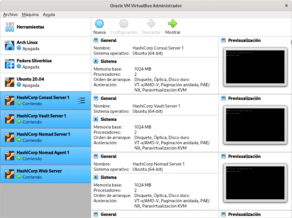 Las máquinas virtuales utilizan la distribución Ubuntu de GNU/Linux en las que se instala las herramientas de HashiCorp para los servidores y adicionalmente Docker en las instancia cliente de Nomad. En la instancia que da acceso a las consolas web de administración se instala el servidor web Nginx que hace de proxy con el servidor de Consul, Vault y Nomad. El aprovisionamiento de las maquinas se realiza con varios scripts de bash que contienen los comandos necesarios para instalar los paquetes, realizar la misma configuración que se realizaría de forma manual desde una terminal y copiar los archivos de configuración y certificados desde la máquina anfitrión a las máquinas virtuales.