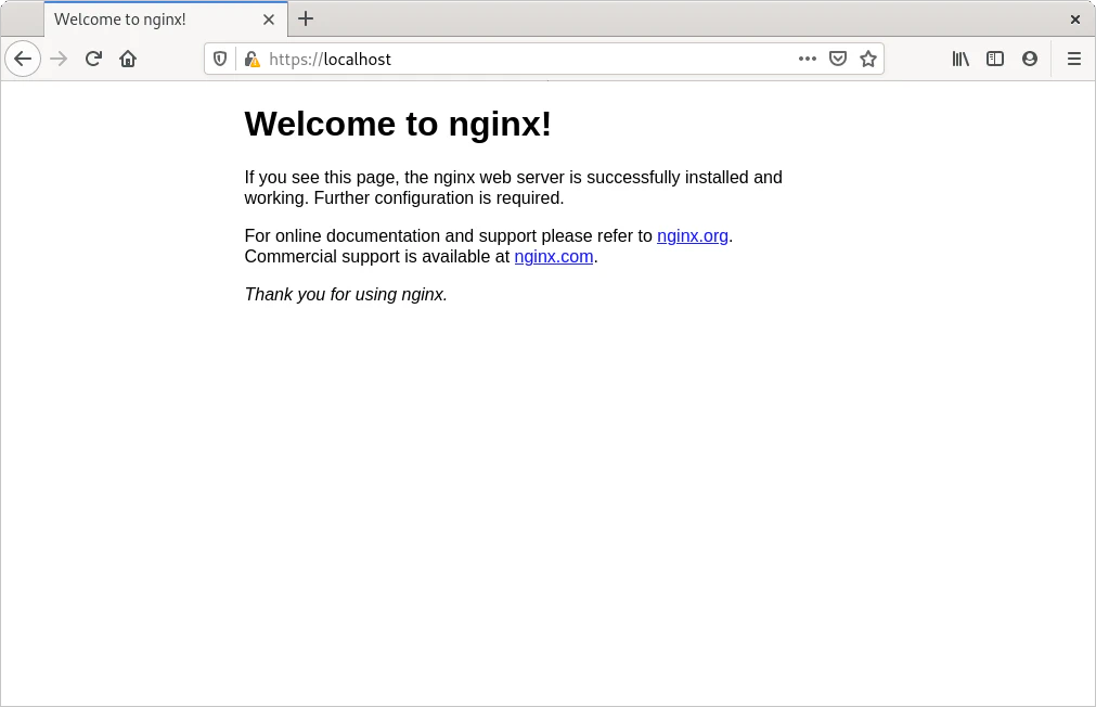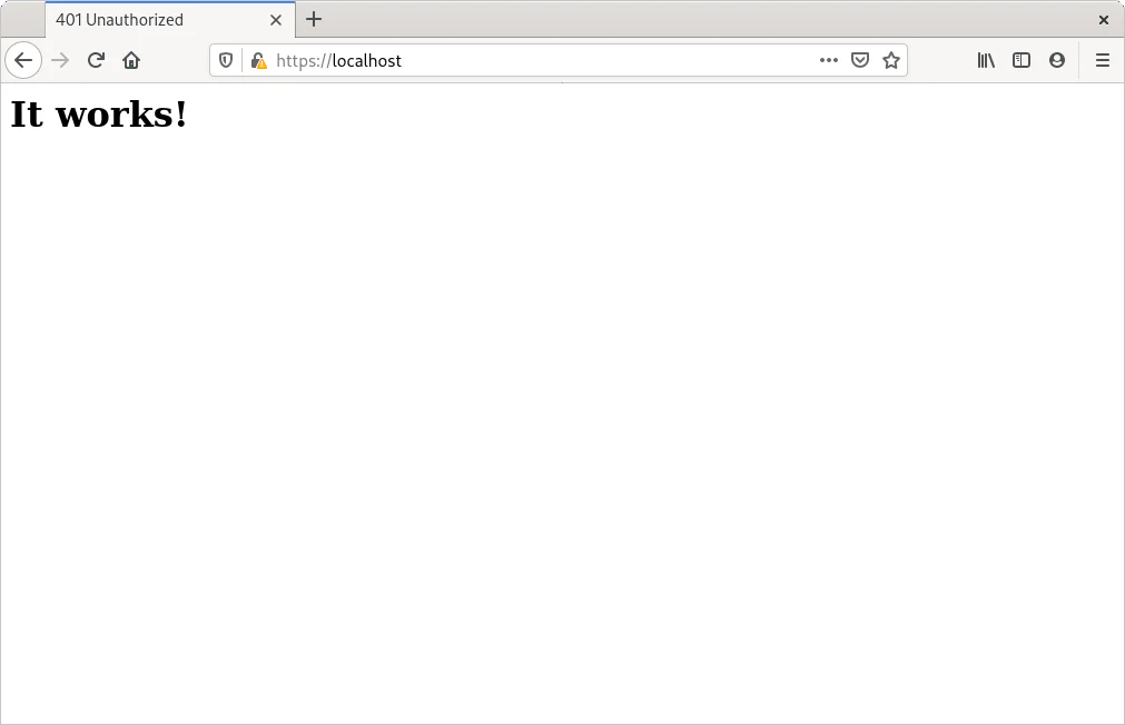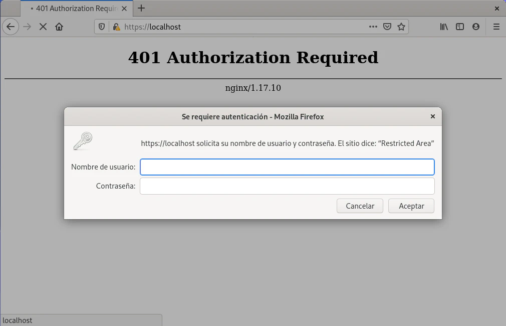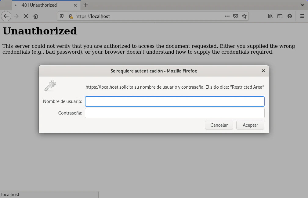 Utilizando Docker se puede crear un contenedor y probar la configuración. Al acceder a la dirección https://localhost el navegador mostrará el diálogo que solicita el usuario y contraseña.