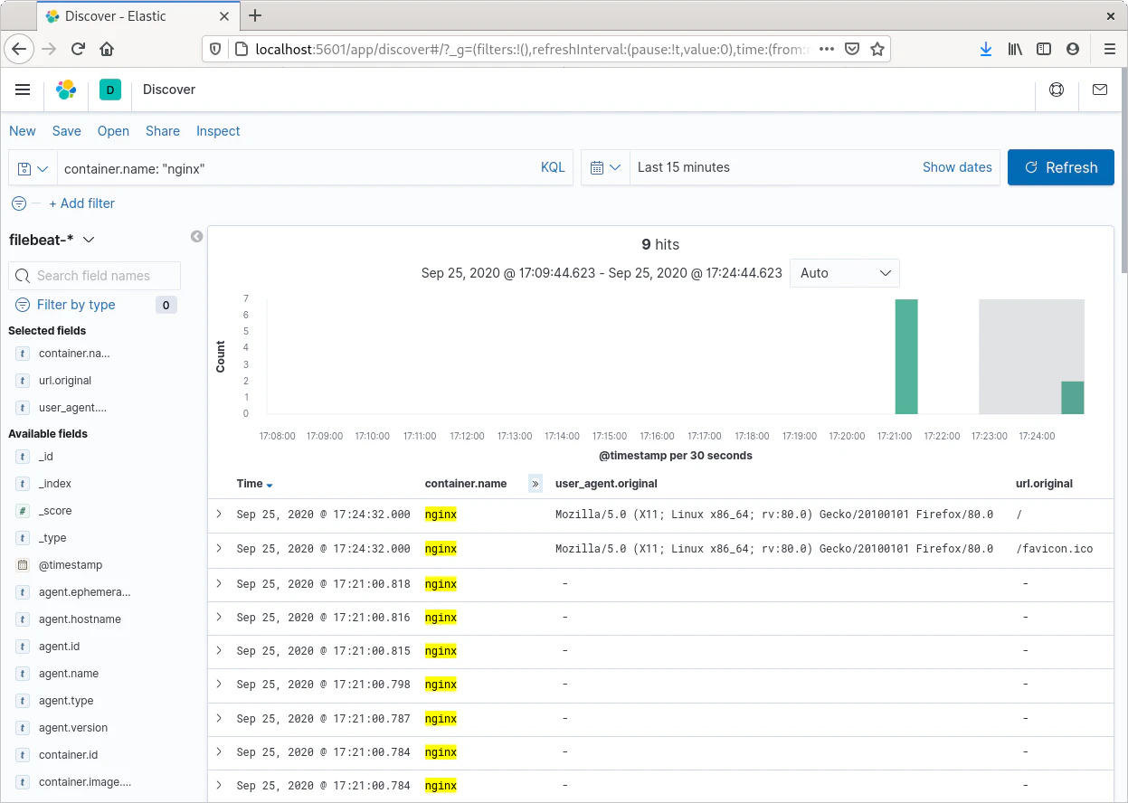Kibana es la herramienta como cliente web que permite consultar las trazas almacenadas en Elasticsearch, permite crear filtros para precisar las trazas a buscar y limitar las consultas a ciertos periodos de tiempo, muestra las ocurrencias encontradas y el número de ellas en un cierto periodo de tiempo. Filebeat además de las trazas que generan los contenedores indexa algunas propiedades adicionales como el nombre del contenedor, la imagen del contenedor, datos del agente que realiza la solicitud, marca de tiempo de generación junto a más datos que permite filtrar para encontrar las trazas deseadas entre todas las indexadas de todos los contenedores. También permite seleccionar las trazas en un rango de tiempo y los campos de datos a mostrar como resultado. Kibana tiene su propia sintaxis para realizar las consultas y permite guardarlas para futuros usos y compartirlas, además de poder construir avanzados paneles de información.
