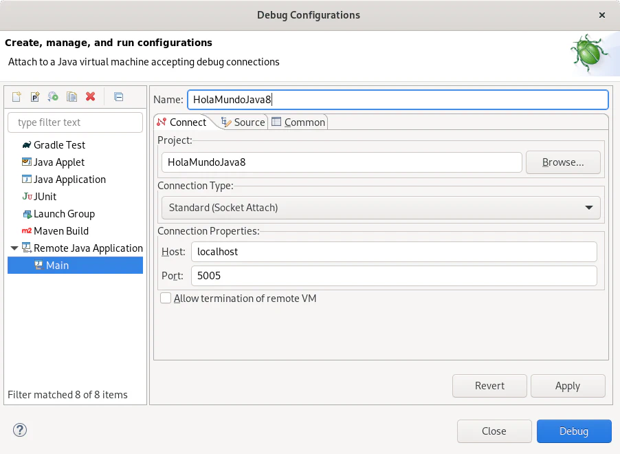 - address=5005: indica el puerto en el que la máquina virtual acepta conexiones.
