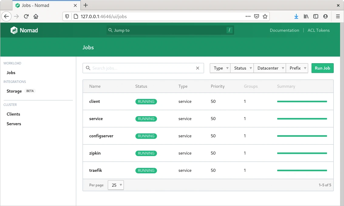 Los siguientes comandos inician el registro y descubrimiento de servicios, el orquestador de contenedores, el servidor de configuración, el servicio, un proxy del servicio que balancea la carga si hubiera diferentes instancias del servicio y admite tolerancia a fallos si alguna de las instancias falla y finalmente el cliente del servicio. En el ejemplo se utiliza Nomad y Docker junto a Consul y Traefik. El ejemplo requiere iniciar Consul y Nomad y tener instalado, configurado y en ejecución Docker.