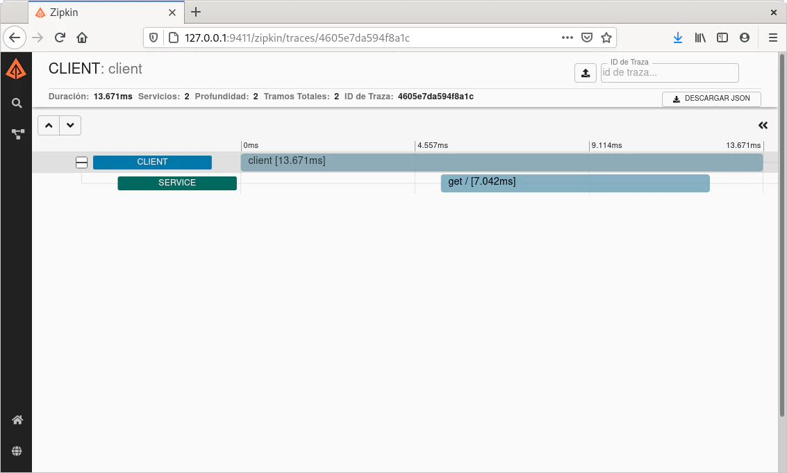 Tanto el microservicio cliente como el microservicio servidor tienen Sleuth integrado y envían de forma asíncrona cuando terminan las peticiones HTTP la información de trazabilidad a Zipkin. Con el traceId de una transacción se observa en Zipkin la cadena de llamadas entre los microservicios y sus tiempos de respuesta. En el ejemplo solo hay dos pero podrían en un caso real quizá sean tres, cuatro o más ya sea porque cada servicio utiliza otro o porque un mismo servicio utiliza varios, ver esta información de forma gráfica es mucho más fácil de analizar que solo con las trazas correlacionadas en ELK.