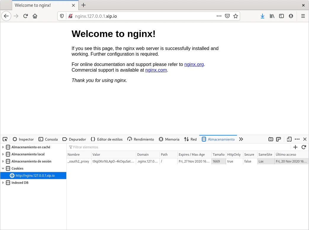 Una vez autenticado el usuario se permite el acceso a la página web, en este caso la página por defecto de Nginx, también se observa la creación de la cookie que mantiene la sesión.