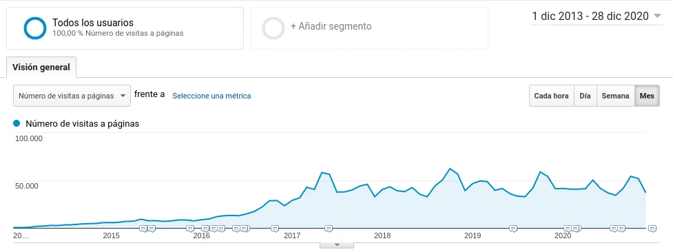 Durante este año atípico de confinamiento y en muchos casos trabajo desde casa las visitas se han mantenido constantes, alrededor de unas 50K visitas mensuales. A pesar de escribir nuevo contenido que debería añadir aún más tráfico el caso es que algunos artículos antiguos también lo pierden con lo que el tráfico de los nuevos artículos solo compensan la pérdida del tráfico de los antiguos. Algunos artículos van perdiendo visitas, porque hay otros blogs que también crean contenido y los artículos van perdiendo posiciones en la clasificación de los buscadores.