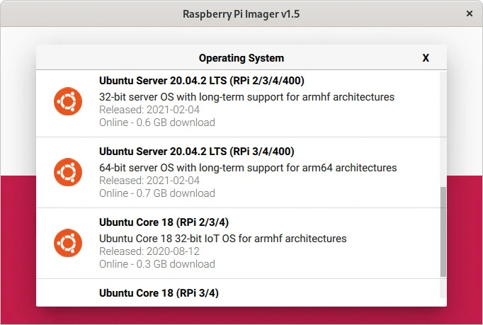 El proceso de instalación de Ubuntu tanto para la versión de escritorio como la para las versiones Server y Core, es posible realizarlas mediante Raspberry Pi Image. Raspberry Pi Image permite seleccionar la versión de Ubuntu y esta se encarga de descargarla e instalarla en la tarjeta microSD seleccionada.