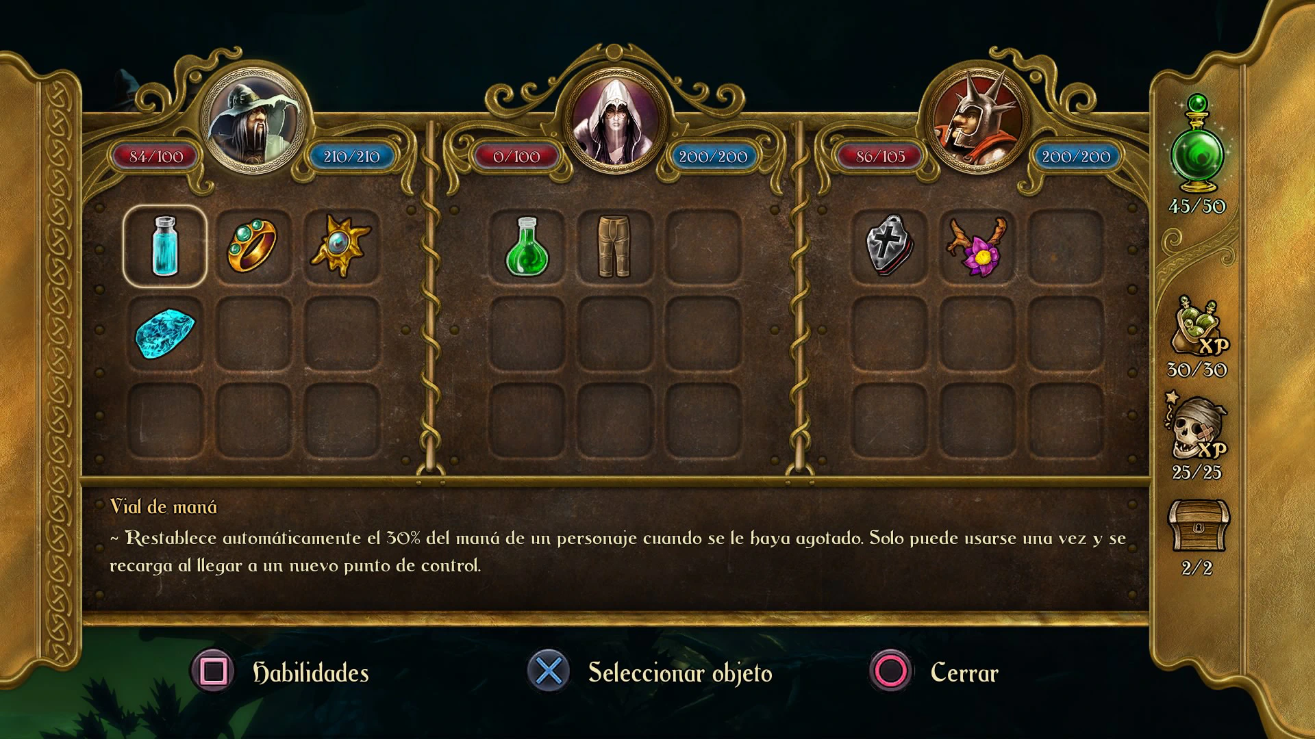El juego básicamente es un juego de plataformas en el que en alguno puntos hay que resolver sencillos puzles con las habilidades combinadas de los personajes. Si la solución para resolver un puzle es demasiado complicada es que esa forma de resolverlo no es la que pensaron los desarrolladores, dados los diferentes personajes y sus habilidades hay múltiples formas válidas de resolver cada puzle. Otro objetivo del juego es recoger todos los orbes de experiencia y encontrar los cofres de tesoro, algunos están un poco escondidos con lo que es necesario fijarse bien en cada una de las secciones de los niveles, después de los primeros niveles se va conociendo que sitios son susceptibles de tener alguna zona oculta a explorar.