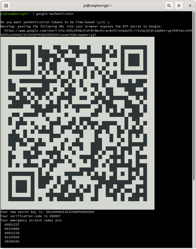 El resultado del comando es un código QR que se puede escanear con la aplicación de Google Authenticator para teléfono inteligente o con la clave secreta utilizar KeePassXC para generar los tokens.