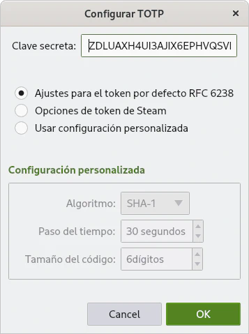 El siguiente comando ejecutado con el usuario permite generar un código QR y la información para generar los tokens o configurar una aplicación como KeePassXC para generarlos. El comando realiza varias preguntas a las que se puede contestar con los siguientes valores.