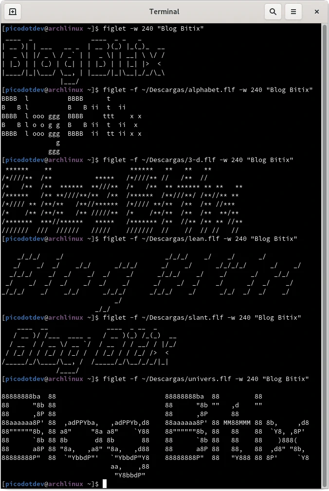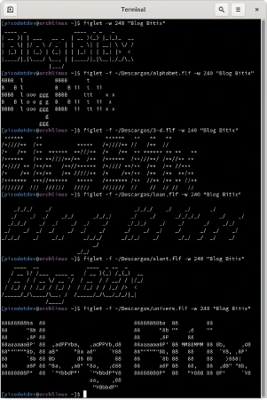 Además de instalar el paquete de figlet en la distribución de GNU/Linux hay que descargar los archivos de las fuentes para generar el arte ASCII con el estilo deseado. La fuente se indica en el comando con el parámetro -f.