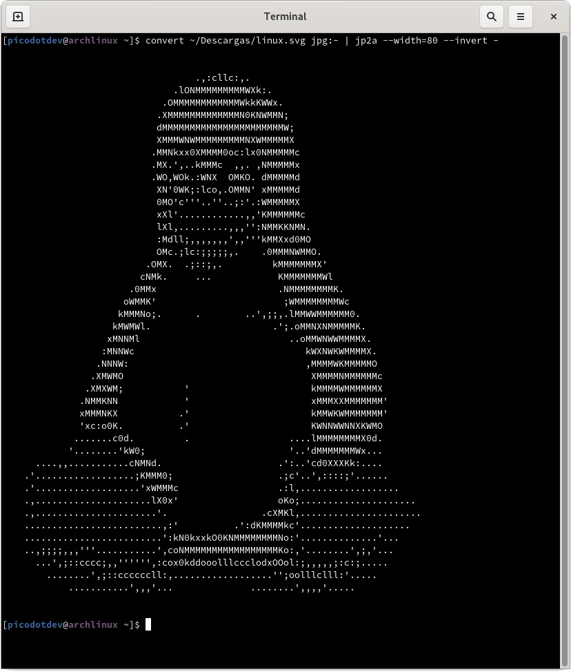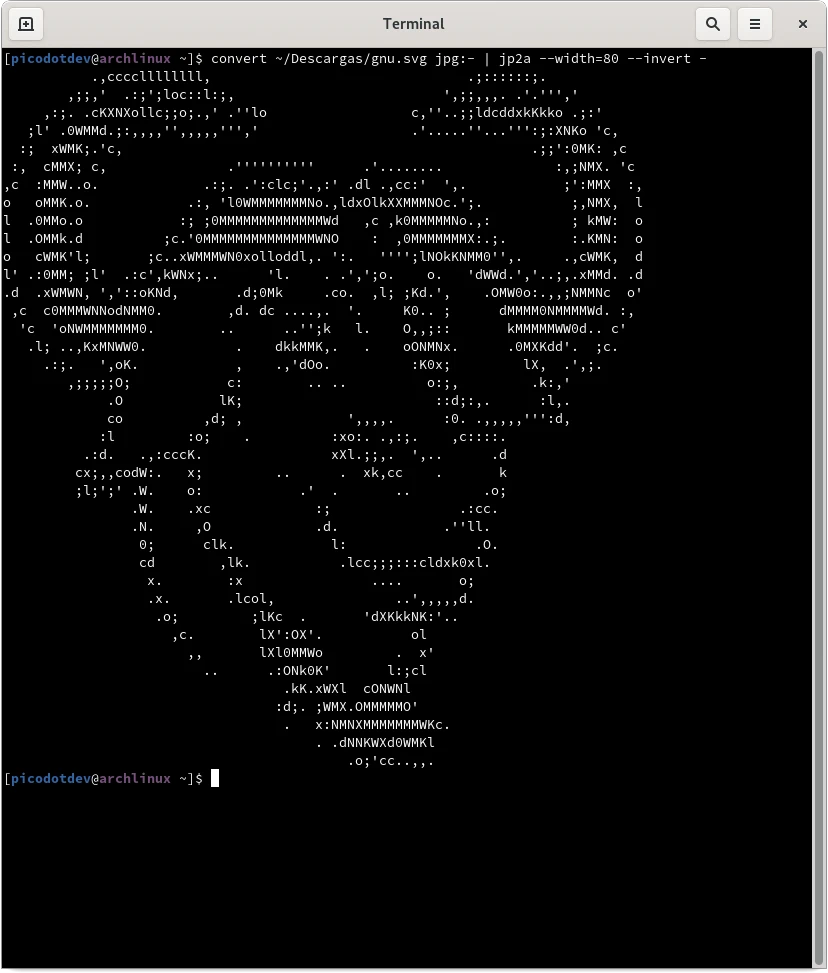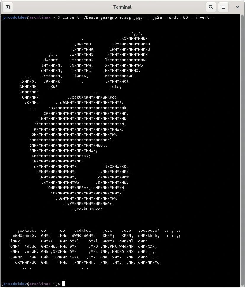 La herramienta jp2a permite convertir una imagen a arte ASCII. Basta con indicar la imagen fuente y personalizar las opciones del resultado como la anchura de caracteres con la opción –width. Utilizando las tuberías del intérprete de comandos es posible combinar el resultado de un comando que procese o transforme la imagen y se la proporcione como entrada a jp2a, en este caso para utilizar formatos no soportado por jp2a convirtiéndolo previamente a uno soportado permite obtener el arte ASCII.