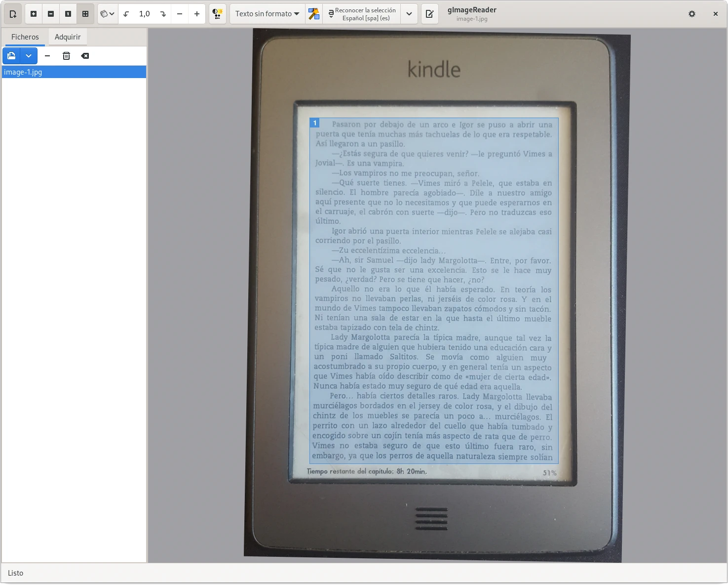 Para el ejemplo he usado la siguiente imagen tomada con la cámara de fotos del móvil a partir de una página de un libro electrónico. El mismo caso es posible aplicarlo a la fotografía tomada de un periódico o de un documento puesto en una pared, lo importante es que que la imagen tenga la mejor calidad posible en cuanto a definición de caracteres, si es una fotografía que esté bien enfocada y sin brillos para que todo el texto sea reconocible. El reconocimiento del texto se realiza con efectividad mientras los caracteres tengan el formato tipográfico impreso en vez de escritura realizada a mano. Aún teniendo la imagen una leve rotación el texto se sigue reconociendo.