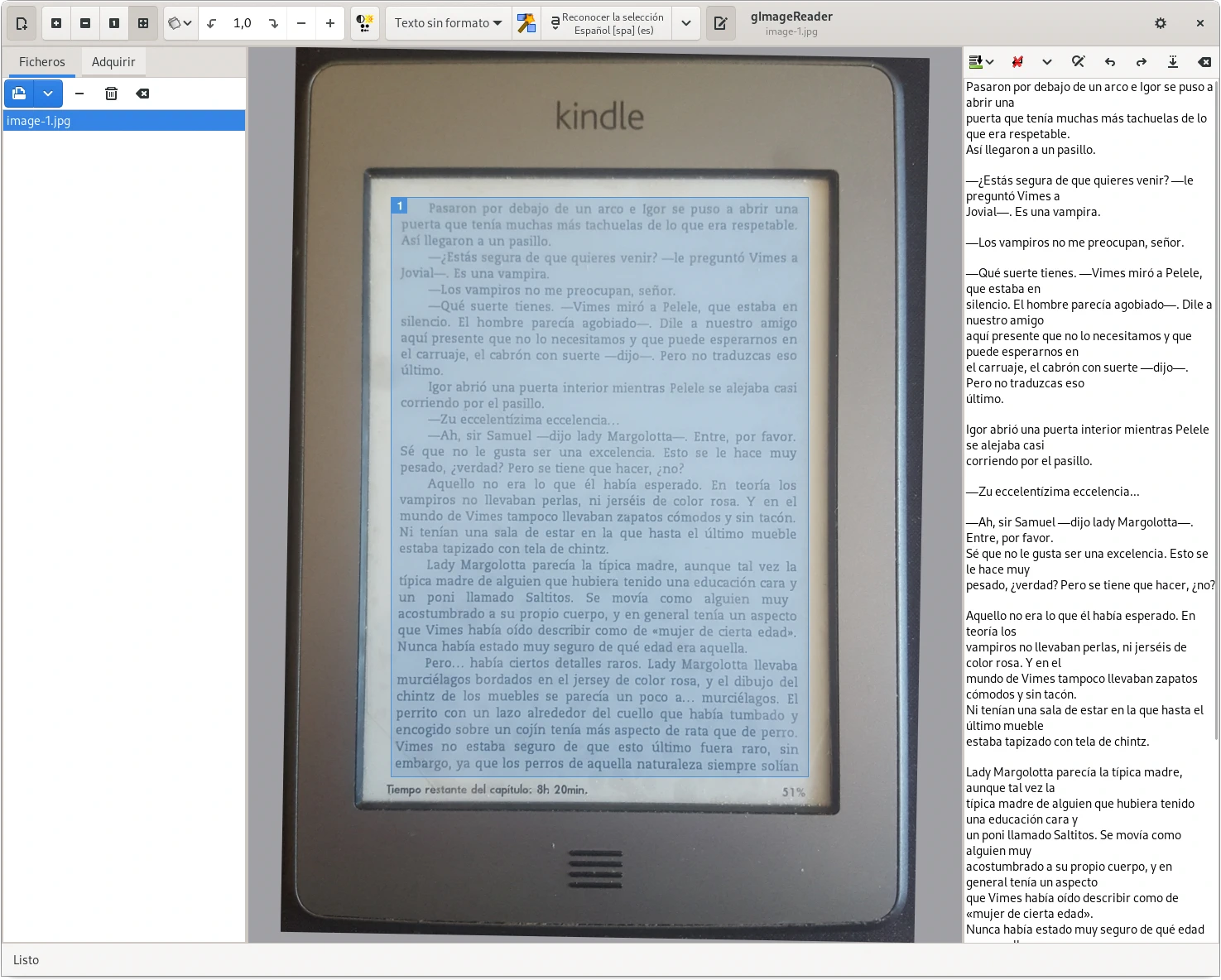 El texto es reconocido con bastante efectividad, el formato no es completamente fiel al original y algunos signos de puntuación pequeños no son reconocidos, sin embargo si la tarea es extrael el texto de un soporte la herramienta es bastante efectiva aunque requiera un revisión y edición posterior.