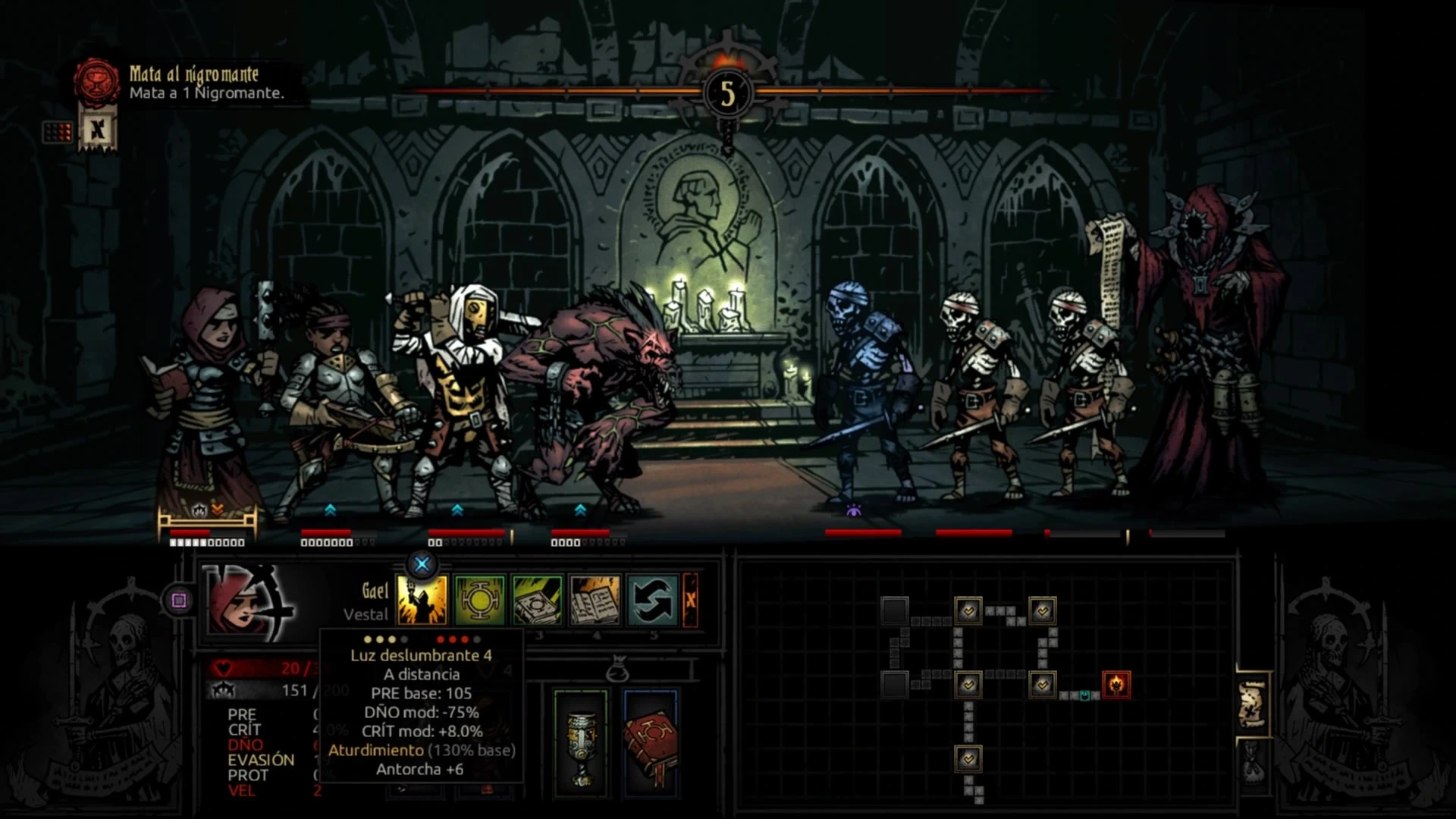 - Vestal, ficha: si posición ideal es la 3. Tiene dos poderosas habilidades de curación, una para un único objetivo y otra que cura menos pero afecta a todo el grupo. Con la habilidad Juicio puede atacar y curarse. Tiene habilidades que restauran el nivel de luz para conservar antorchas en misiones largas.