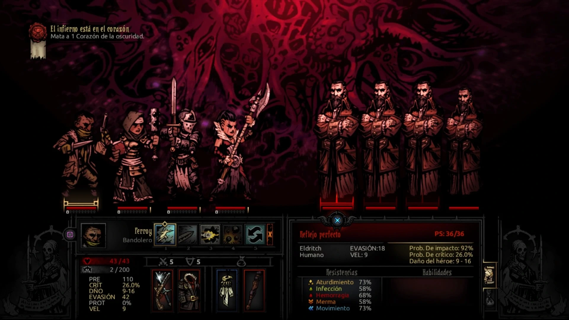 Muchos de los enemigos de la mazmorra oscura son de tipo eldrich con lo que si a lo largo de ganar determinación algún personaje de los que su misión principal es hacer daño consigue la habilidad que hace más daño, crítico o reduce el esfuerzo contra este tipo de enemigos conviene fijar la habilidad para que no la pierdan.