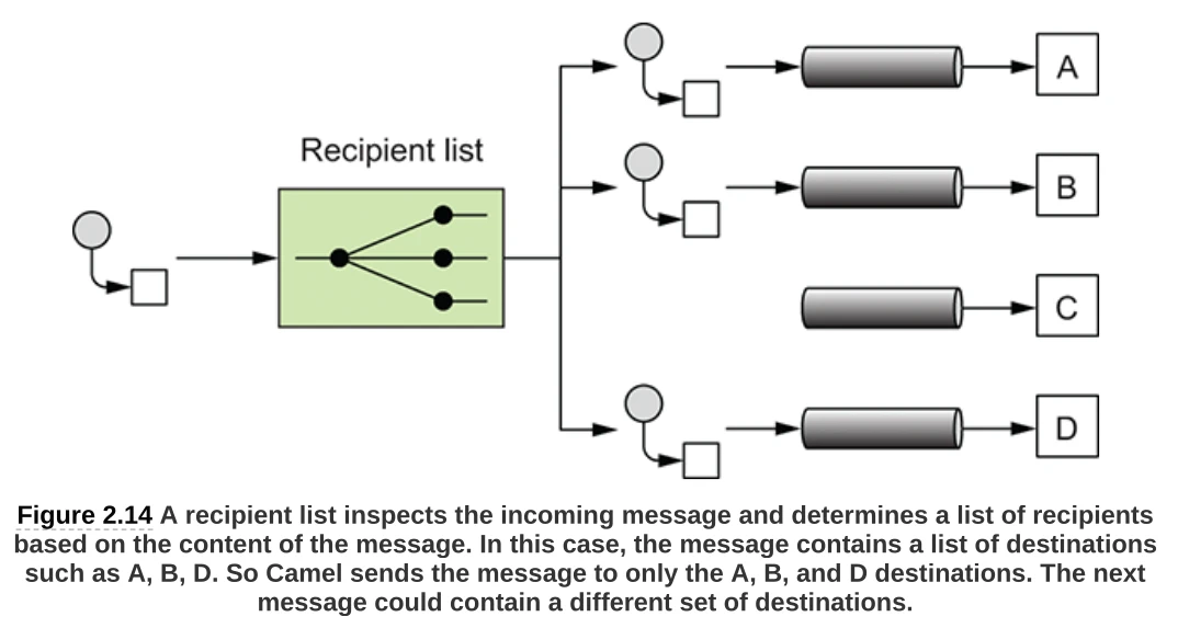 Algunos de los patrones básicos que soporta Apache Camel son choice para elegir rutas alternativas a las que dirigir los mensajes, filter para descartar los mensajes que no cumplan alguna condición, multicast para enviar un mensaje a varios destinos, recipient list para enviar a varios destinos de forma dinámica o wire tap para inspeccionar los mensajes sin alterar su flujo normal. Esos son solo unos pocos patrones de integración soportados.