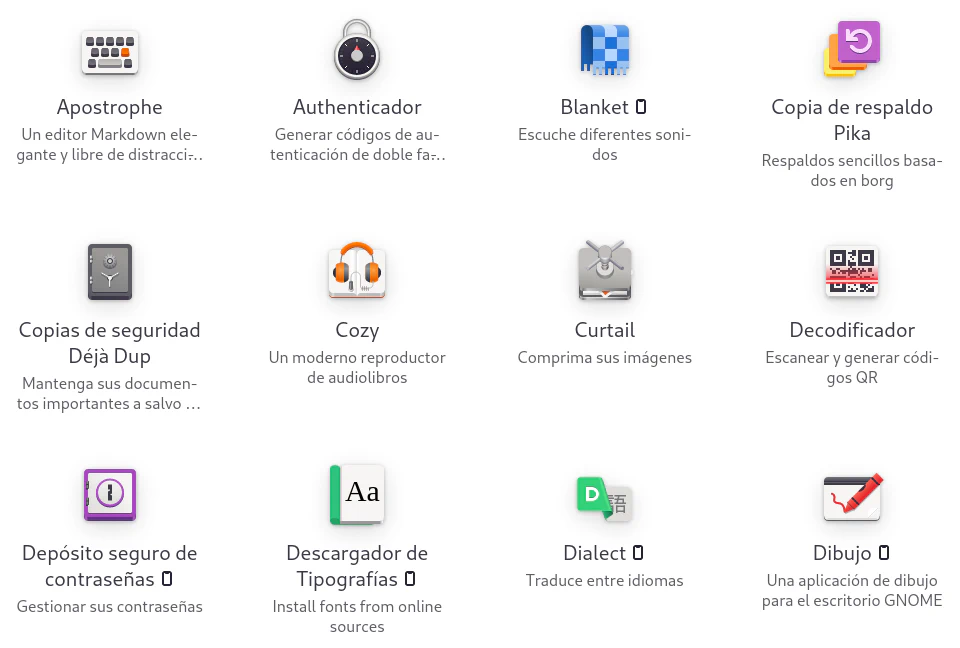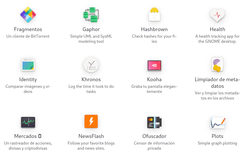 Algunas aplicaciones aunque desarrolladas por terceros siguen las guías de estilos de diseño de interfaces del escritorio de GNOME dando la sensación que están perfectamente integradas con el entorno de escritorio. Muchas son aplicaciones distribuidas como paquetes en formato Flatpak que las hace fácil de instalar en cualquier distribución GNU/Linux sin depender de los paquetes oficiales de la distribución.