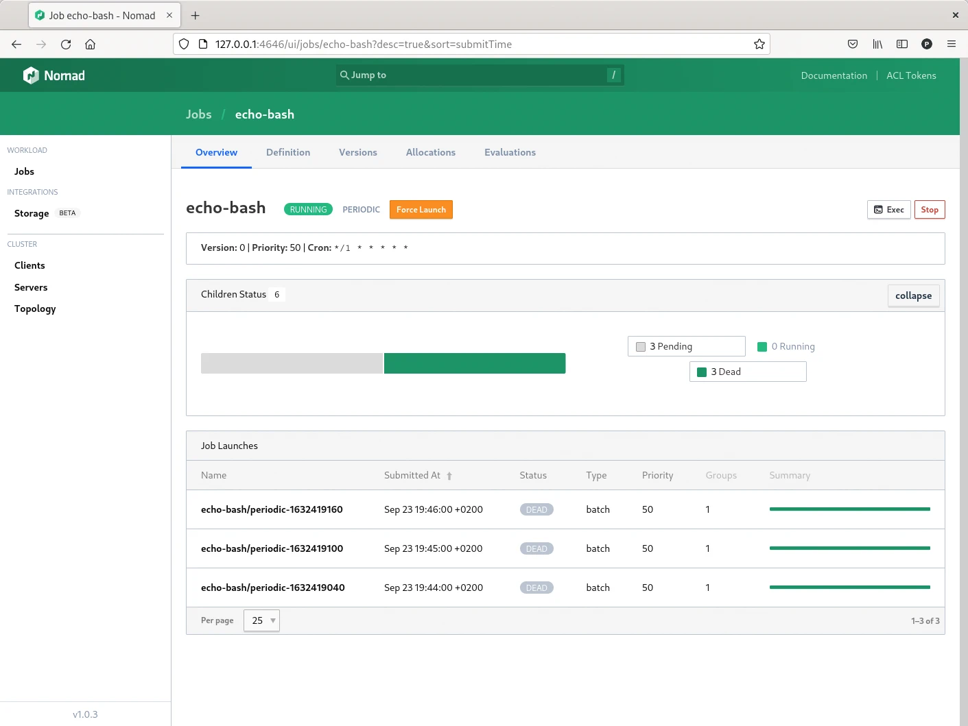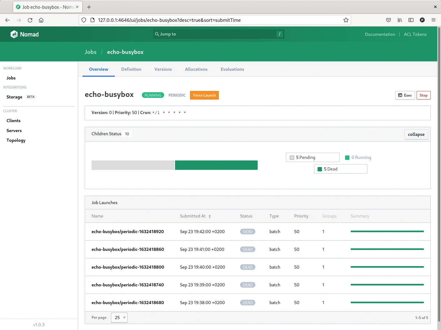 En este ejemplo se muestran la definición de dos tareas o jobs para Nomad, una como definida como un proceso del sistema a partir de los comandos disponibles en la máquina en la que se ejecuta y otra tarea como un contenedor de Docker. Ambas tareas son lo más simple posible emitiendo únicamente en la salida estándar un mensaje, en el caso del proceso del sistema con el comando echo y en el caso del contenedor con el mismo comando de una imagen de contenedor con BusyBox. En la definición de las tareas de Nomad se planifica su ejecución con una expresión cron cada un minuto.