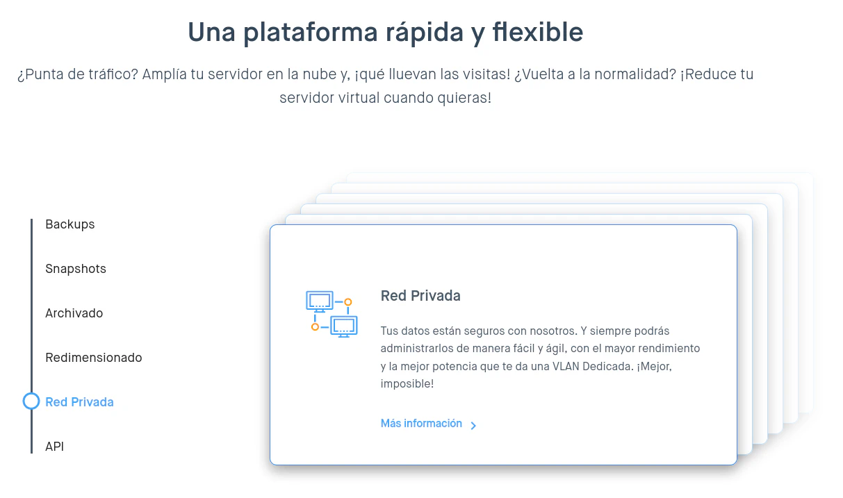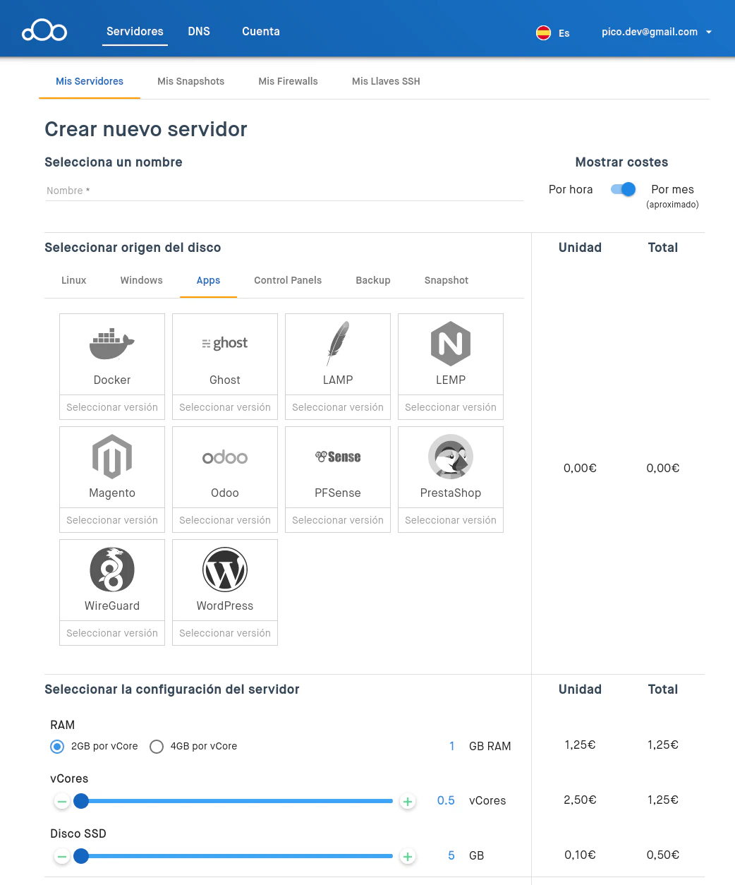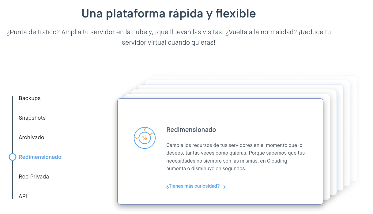 Clouding permite seleccionar los recursos de cómputo para los servidores según las necesidades partiendo de la opción más básica de 1/2 unidades de cómputo, 2 GiB por core y 5 GiB de almacenamiento con la opción de elegir Linux o Windows como sistema operativo y dentro de Linux con varias distribuciones y versiones como Ubuntu, Centos o Debian. Esta opción más básica que ya es apta para algunos servicios parte de los 3 € al mes, la opción más capaz llega a las 48 unidades de cómputo o cores, 192 GiB de memoria y casi 2 TiB de almacenamiento suficiente incluso para las necesidades empresariales más exigentes con un precio de 550 € al mes. Y entre la opción más básica y la más capaz la posibilidad de elegir individualmente cada uno de los tres parámetros principales de configuración como unidades de cómputo, memoria y almacenamiento gracias a la computación cloud y una ventaja de los servidores virtuales privados de la generación anterior que no tenían una configuración tan flexible.