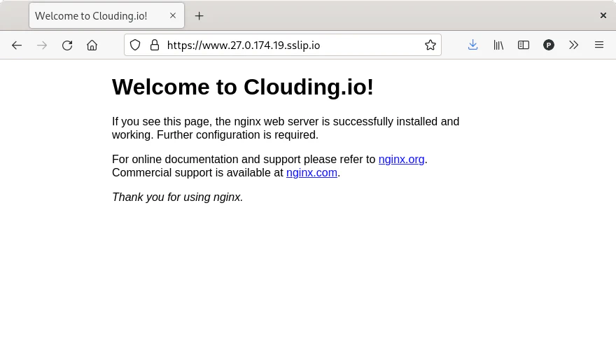 Para configurar el servidor he utilizado como nombre de dominio uno proporcionado por sslip de forma que sea posible configurar el servidor web virtual en Nginx. Con el servidor configurado con los pasos anteriores el y accediendo con el navegador web a la dirección del servidor se obtiene la página con el mensaje de bienvenida, utiliza el protocolo seguro HTTPS con el certificado de Let’s Encrypt y que el navegador Firefox reconocer como autoridad de certificación válida y sin mostrar ningún error en la barra de direcciones.