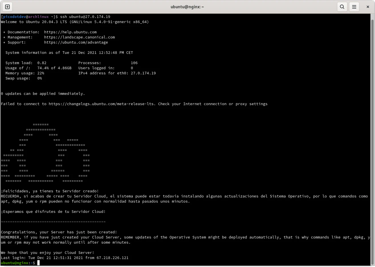 En este ejemplo muestro como aprovisionar un servidor cloud de Clouding de forma automatizada con la herramienta Ansible. El servidor cloud creado en el paso anterior tiene el sistema operativo Ubuntu en la versión LTS 20.04, la funcionalidad del servidor es la de un servidor web con Nginx instalado como paquete de software de Ubuntu por más sencillez para el ejemplo que instalarlo con Docker, para que el servidor utilice el protocolo HTTPS es necesario un certificado que con el servicio de Let’s Encrypt permite obtenerlo de forma rápida y automatizada.