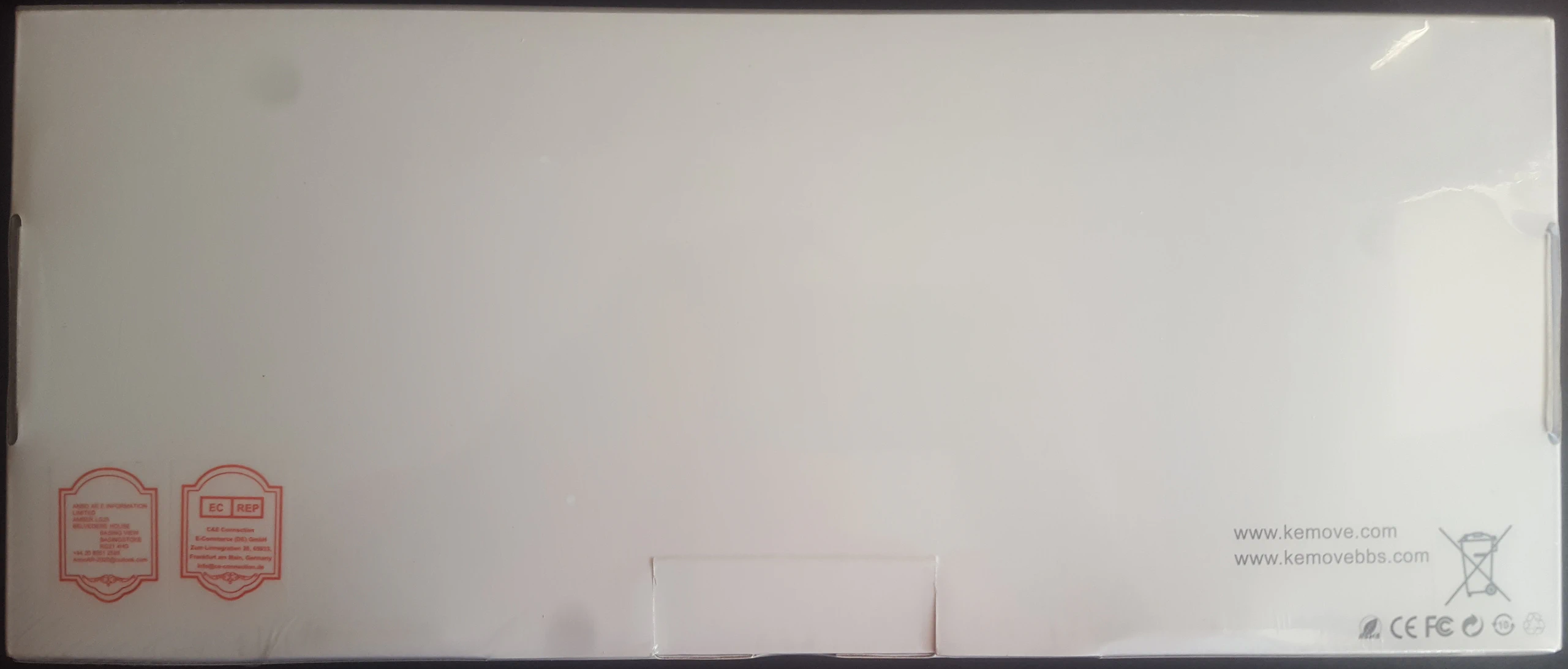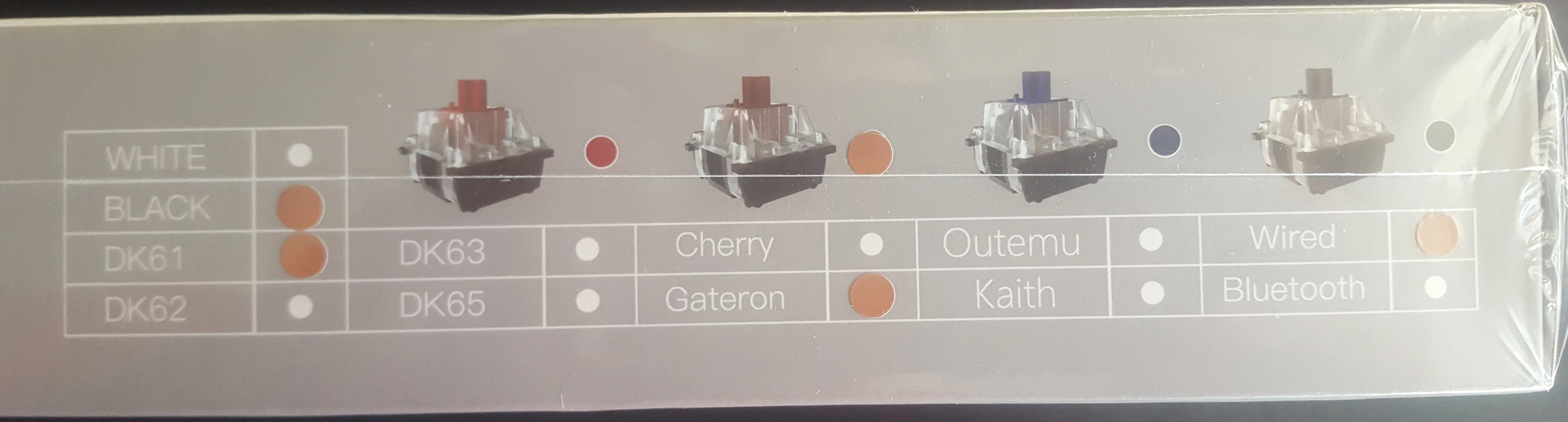 La caja es una caja especial con un diseño estético completamente en blanco salvo por el nombre de la marca y su logotipo en la parte frontal, tanto las letras como el logotipo tienen un aspecto metálico e irisado que cambia de color con por el efecto de la luz, además tienen cierto relieve notándose al tacto. En el lateral hay una leyenda donde se indica el modelo de teclado DK61, tipo de switches en este caso brown y tipos conexión mercado cableado. Aparte de esos aspectos, la caja no tiene nada que indique cuál es su contenido o aspecto del teclado. En la caja no se indica cuales es el inventario de los componentes que incluye.