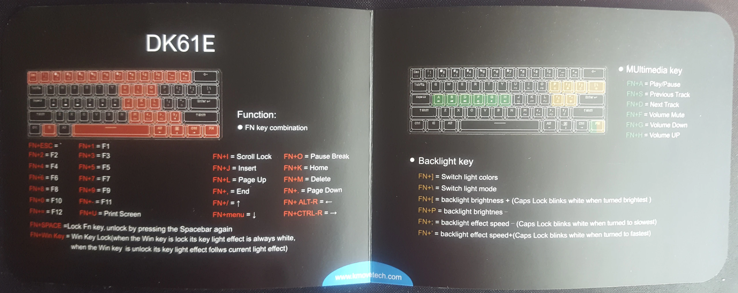 La base del fondo de las teclas es blanco que hace que al encender la iluminación RGB destaque más en condiciones de baja iluminación. La iluminación se puede apagar completamente, tiene varios efectos de luz, permite cambiar la intensidad de la luz y la velocidad del efecto de luz desde el propio teclado sin necesidad de la aplicación de escritorio con la combinación de teclas con la tecla FN. También con la tecla FN soporta las teclas multimedia para silenciar, bajar, subir el volumen y de reproducción para los programas de música o vídeo. Una funcionalidad útil es poder bloquear el teclado en modo FN de modo que entrado en el modo no hace falta mantener presionada la tecla función para usar las teclas de la capa de fusión, se entra en modo bloqueo de la capa de función con la combinación FN+Space y se sale con la misma combinación o única pulsación de Space.