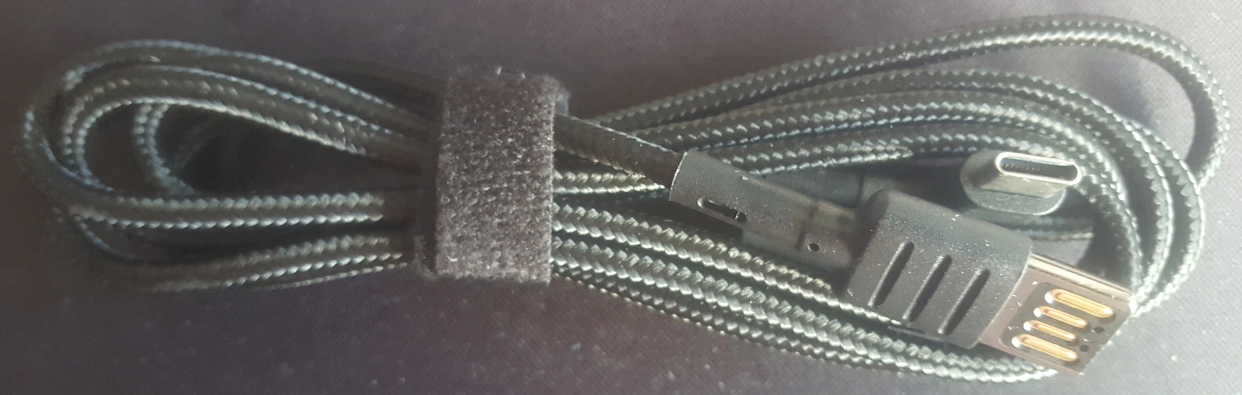 El cable es mallado con una útil brida para recoger el cable sobrante lo que permite mantener la mesa ordenada y sin molestias de cables. Un detalle destacable es que el extremo que se conecta al ordenador es de tipo A reversible con lo que tiene la misma ventaja de los cables USB de tipo C de poder conectarlos en cualquier orientación, esto evita estar probando en qué orientación hay que conectar el cable sobre todo en los casos en los que el conector del ordenador no tenga fácil alcance.