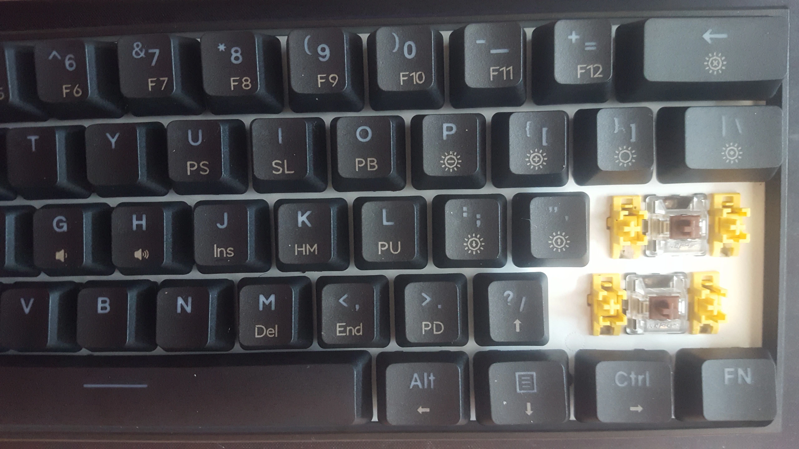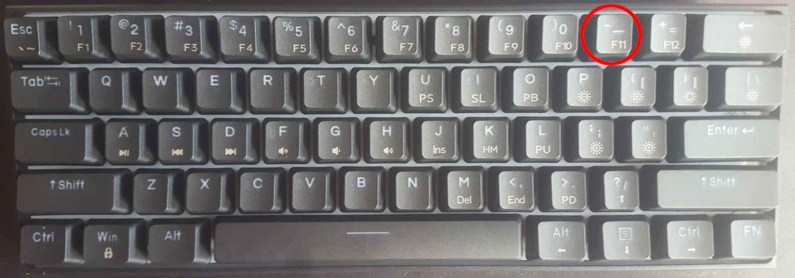 Por comentar algún defecto, si no estoy equivocado la serigrafía de la tecla de los caracteres -, _, F11 no es correcta. En esta tecla en la disposición en inglés el caracter principal es el - y el caracter escrito con la tecla Shift es _. Según la convención empleada por el teclado en la serigrafía el caracter principal se posiciona en la parte baja pero en la tecla F11 no sigue esta conveción, según la serigrafía de la tecla F11 y por la conveción aplicada en otras teclas parece que el caracter principal es _ y el secundario - cuando es justo al revés.