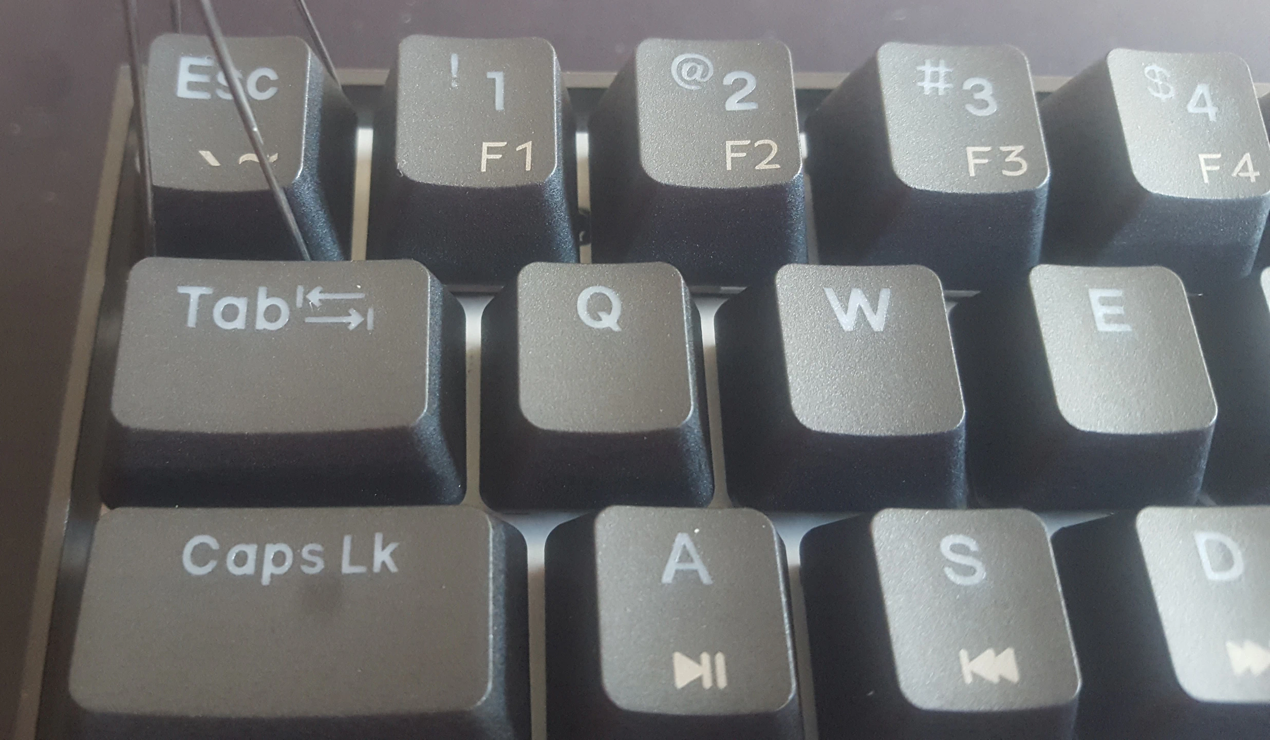 Los keycaps son de material PBT double shot que tienen mayor coste de fabricación pero se consideran de mayor calidad ya que resisten el desgaste y no adquieren tanto brillo como el plástico ABS. Al ser de doble disparo las leyendas de las teclas no tiene el problema de que al cabo del tiempo las más usadas desaparezcan. La serigrafía de las teclas de función no es translúcida, la serigrafía de leyenda de la tecla de función en vez de ser double shot es laser etched.