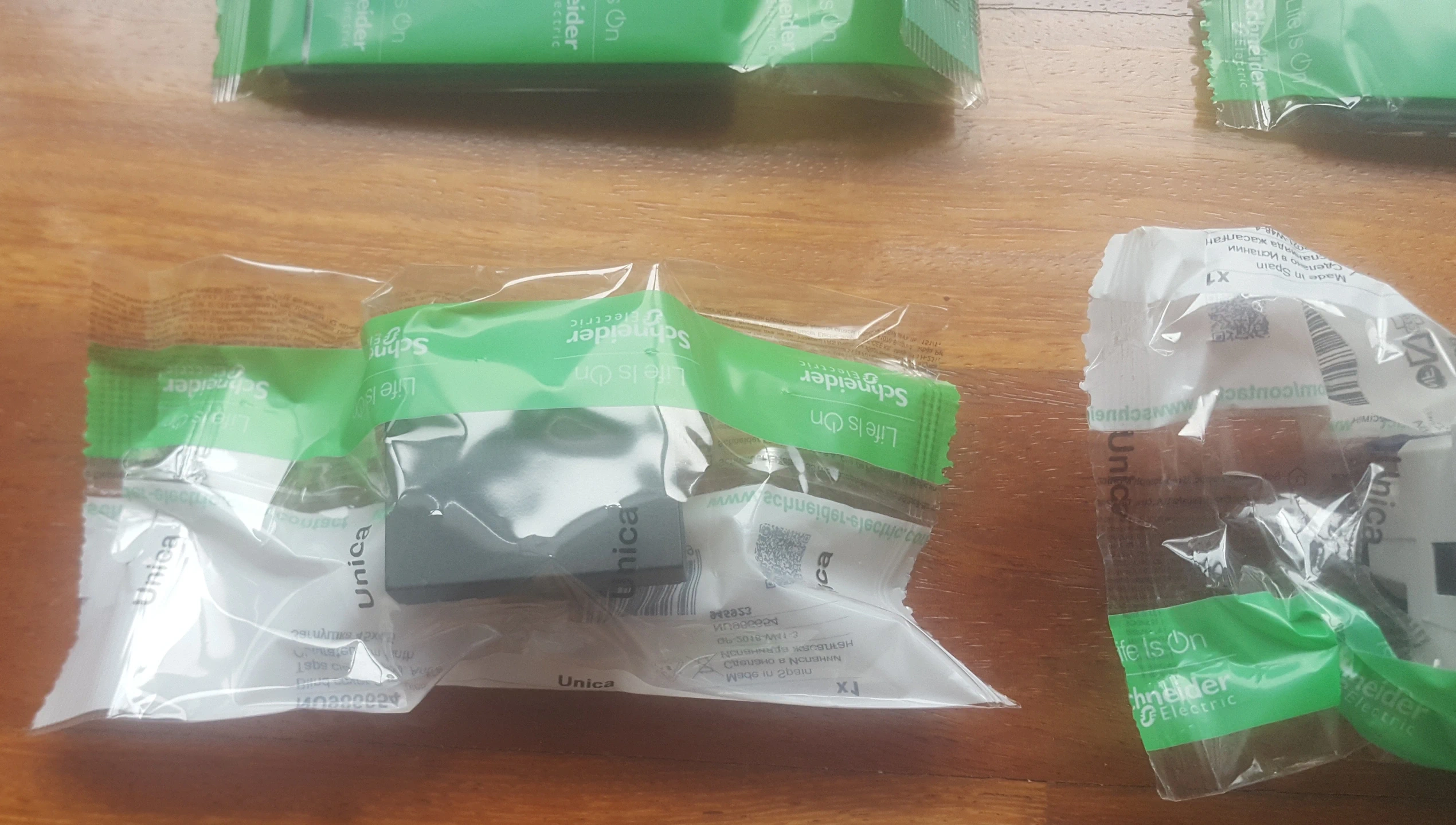Las imágenes de la sección anterior de mecanismos eléctricos son de la serie New Unica ya desempaquetados y abierto su embalaje, estas son las imágenes del paquete original y el embalaje de los elementos de la serie. Excepto los bastidores los demás elementos van embalados en una bolsa de plástico en la que se indica el número de la referencia al que corresponde el contenido. Las referencias qu se muestran en las imágenes están los marcos, los bastidores, enchufe schuko, interruptor ancho, interruptor estrecho y placa ciega en color antracita.