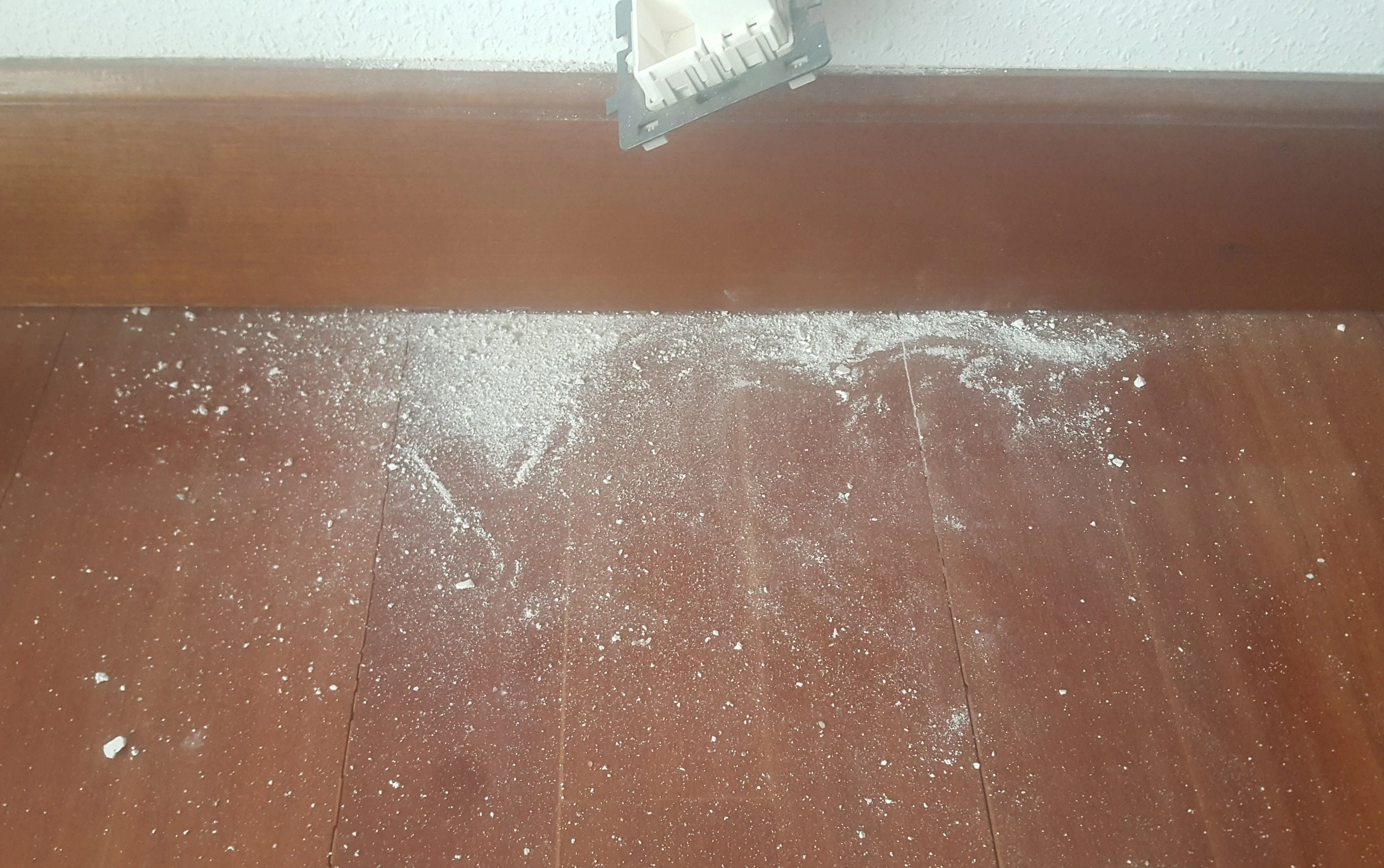 Para evitar que el polvo caiga a la tarima mejor poner un papel que lo evite en la medida de lo posible, solo es polvo pero al barrer es abrasivo con el barniz de la tarima si no se tiene cuidado. Se aprecia la cantidad de suciedad que dejaron en los registros de las cajas los obreros en la construcción.
