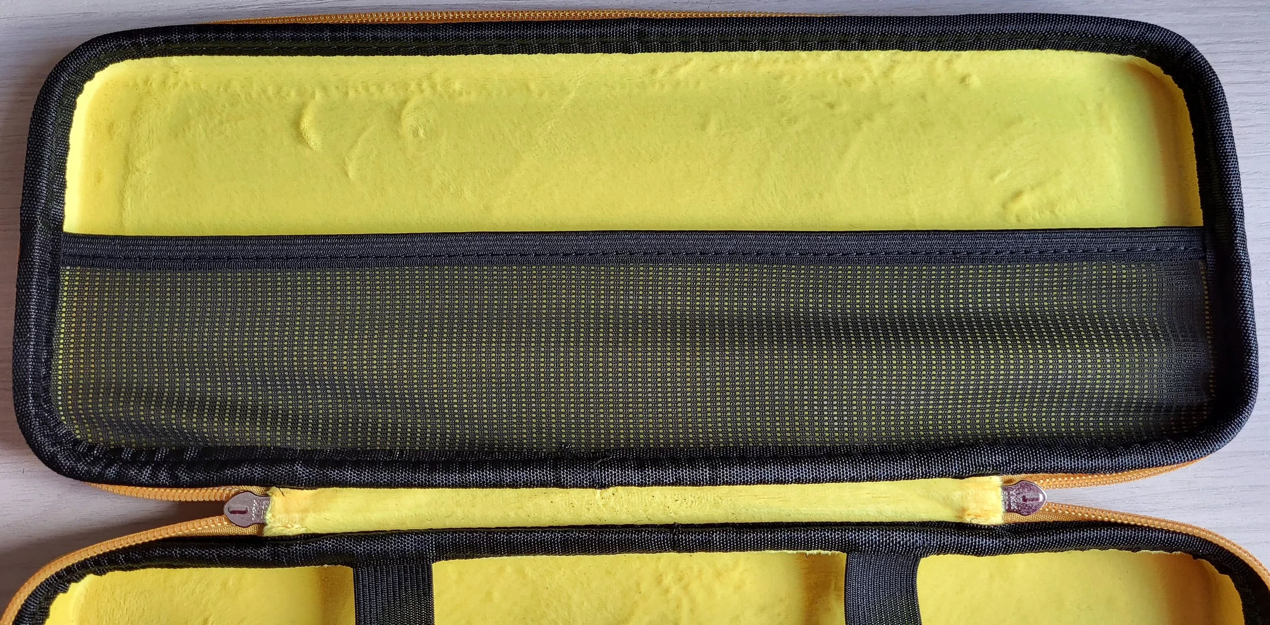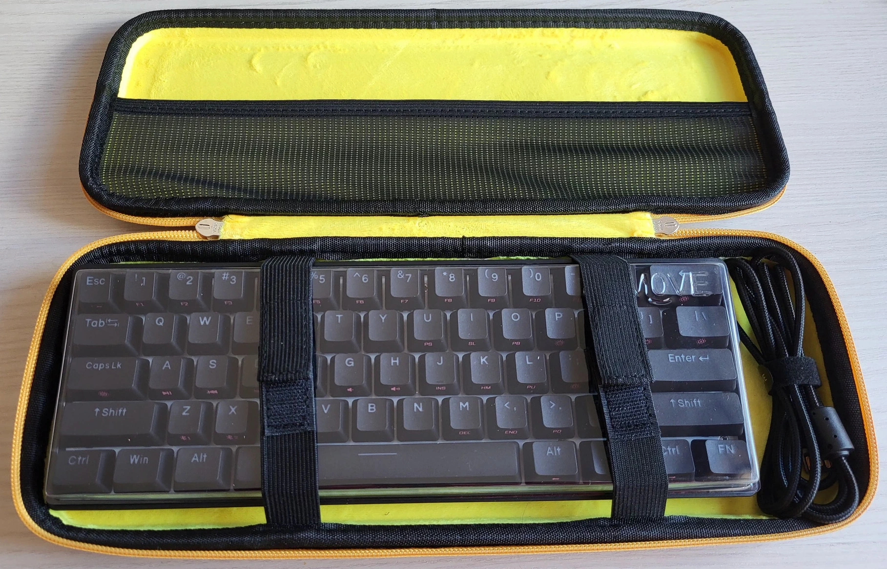 La parte interior está cubierta de un material suave de color amarillo fosforito que evita cualquier arañazo en el teclado. Posee dos bridas elásticas que se unen mediante velcro para sujetar el teclado firmemente y que no se golpee en el interior al moverlo. Las bridas no es imprescindible usarlas pero al usarlas hacen presión sobre algunos keycaps y pulsa las teclas de modo que para proteger mejor esos keycaps es muy útil la cubierta de plástico que se incluye en el teclado KEMOVE DK61 y KEMOVE ARES. Además la parte interior posee una malla para guardar algún pequeño elemento como por ejemplo el cable de conexión al ordenador si este es desmontable como lo es en todos los teclados de KEMOVE. Esta parte interior tiene un olor de fábrica intenso que espero después de varios días después de desempaquetado desaparezca.