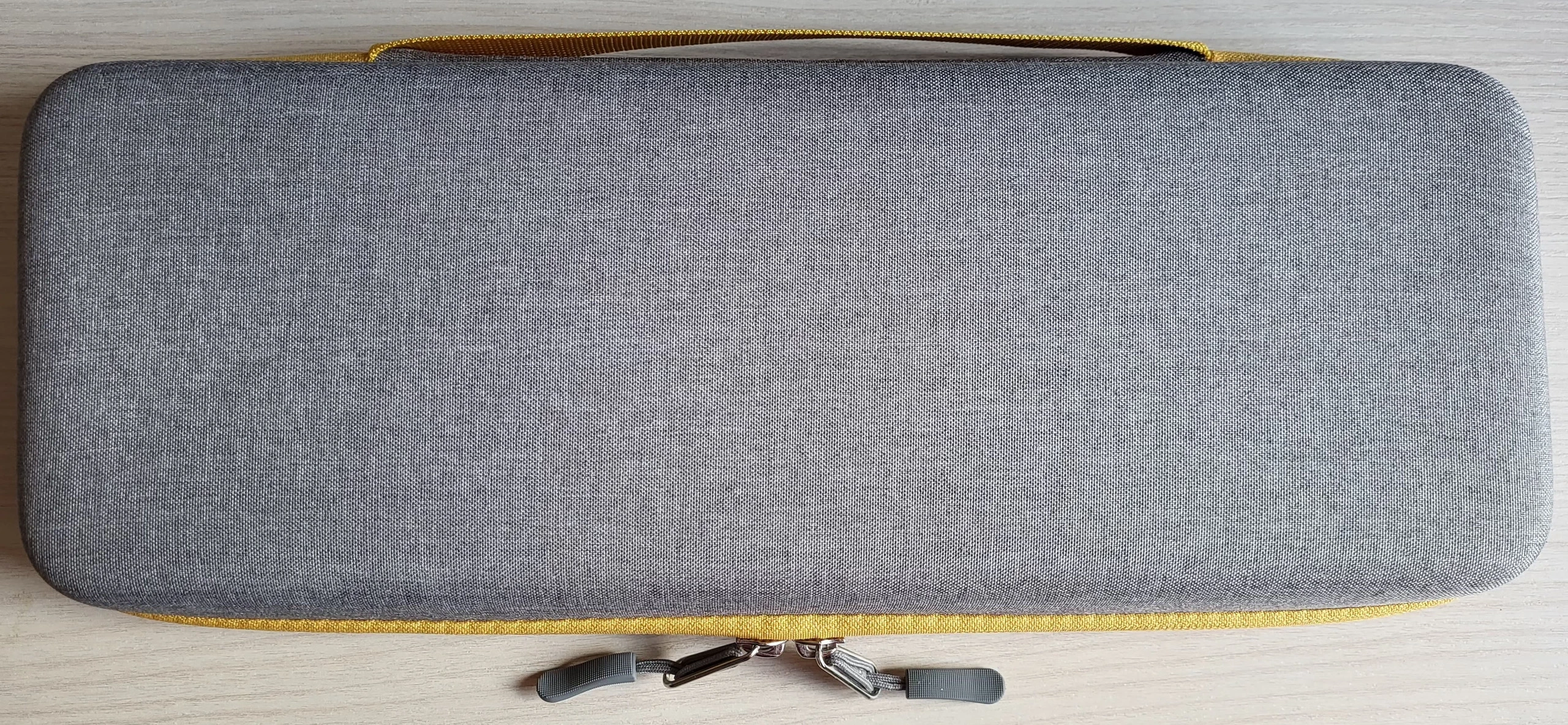 La funda tiene un tamaño de 35,5 cm de ancho, 14 cm de largo y 5 cm de alto, un poco más grande que las dimensiones de un teclado 60 % con suficiente espacio para meter también el cable y algún pequeño objeto no muy grueso, su peso es insignificante comparado con la de un teclado. Es apta para teclados de 61 teclas, 63 teclas y posiblemente para teclados para teclados un poco más grandes. Los teclados TKL son demasiado grandes para esta funda.