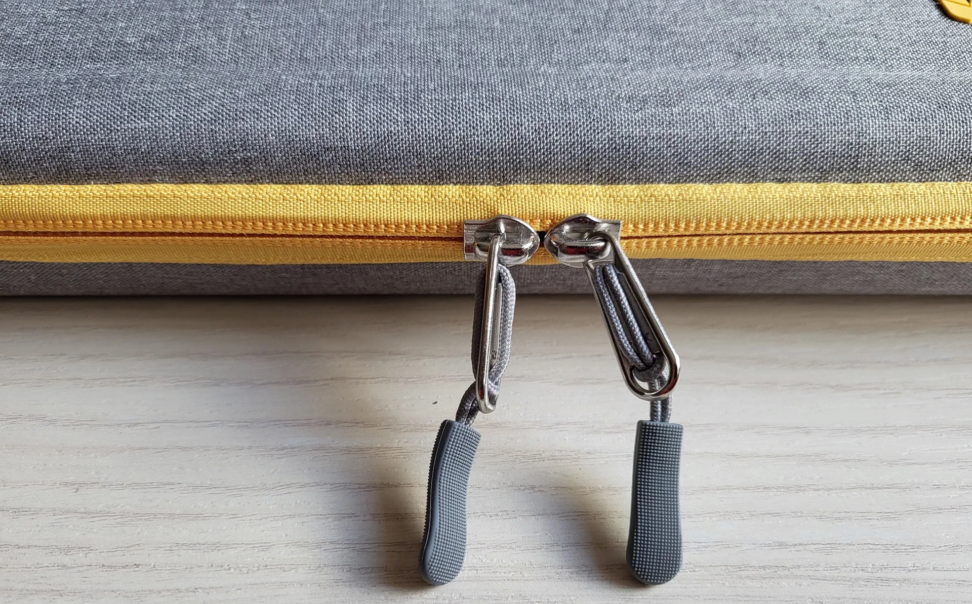 En la parte superior tiene un asa que permite llevar la funda en caso de no meterla en una mochila. Tiene doble cremallera de dientes pequeños que permite abrir la funda en dos direcciones o en una sola según se prefiera con tiradores de metal que incluyen un cordón para mayor comodidad.