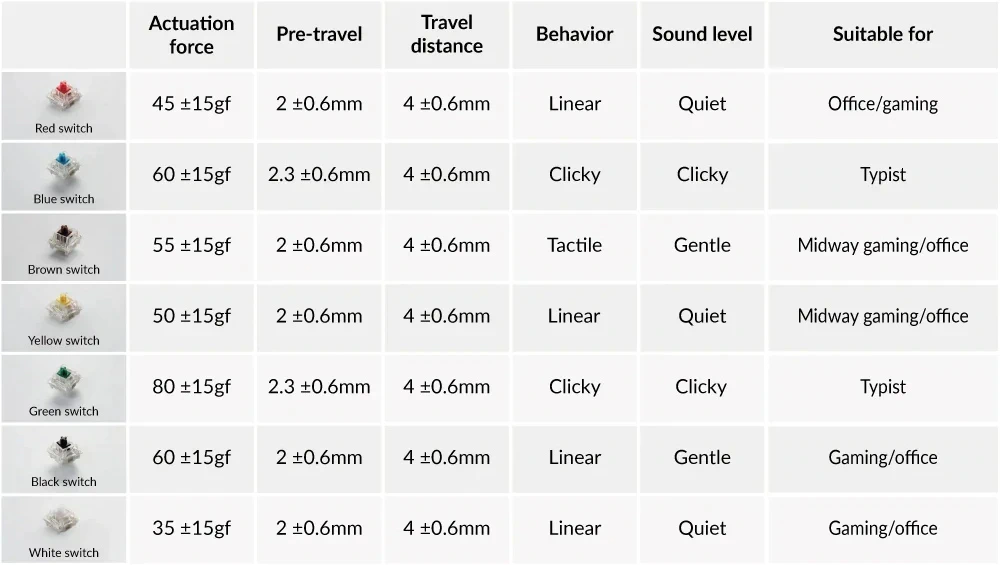 En la página de Gateron hay una leyenda con la descripción de cada switch según su color tanto de qué tipo son, su fuerza de actuación y recorrido. En general unos rojos para los lineales y los marrones para los táctiles son los más comunes.