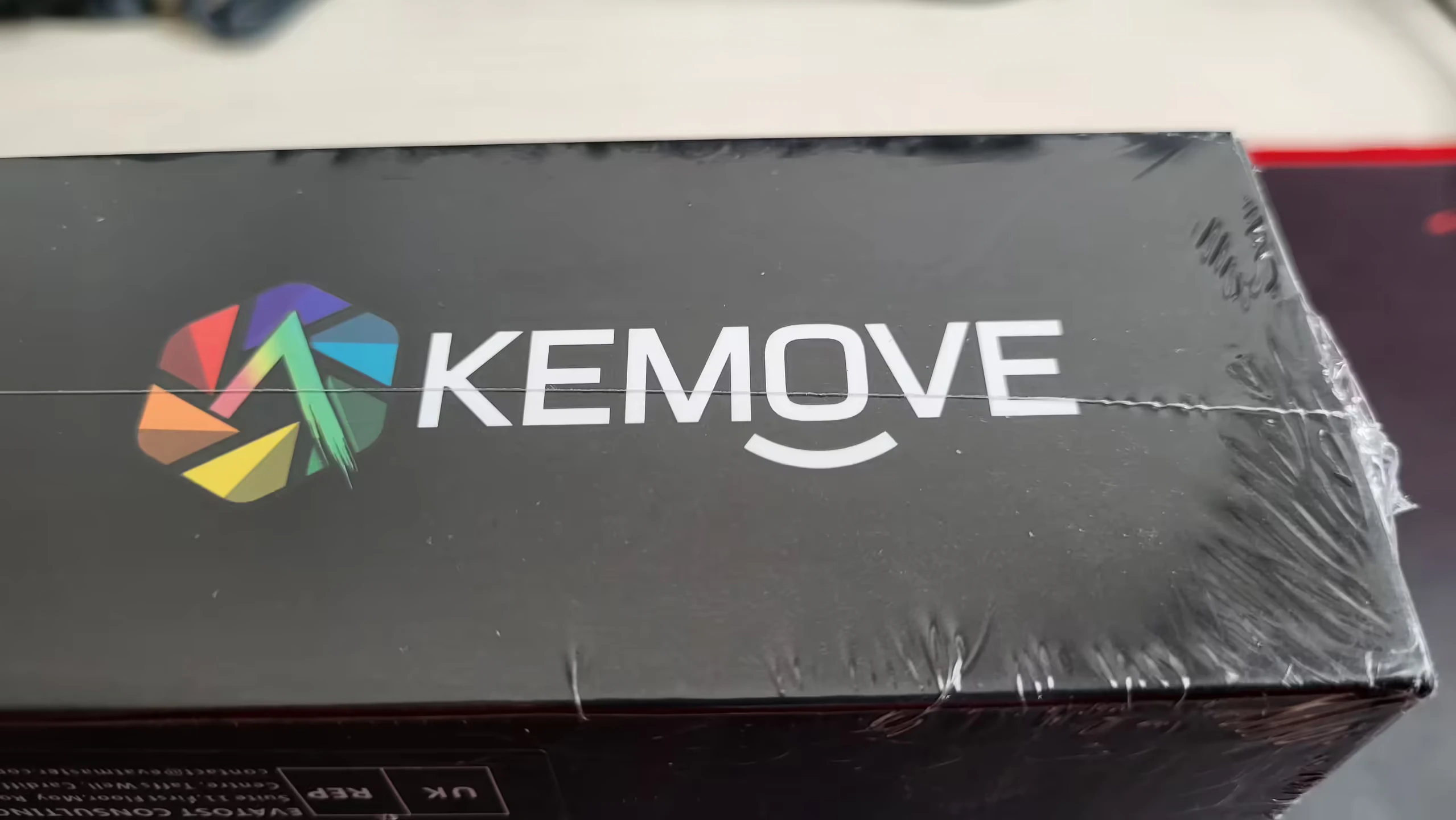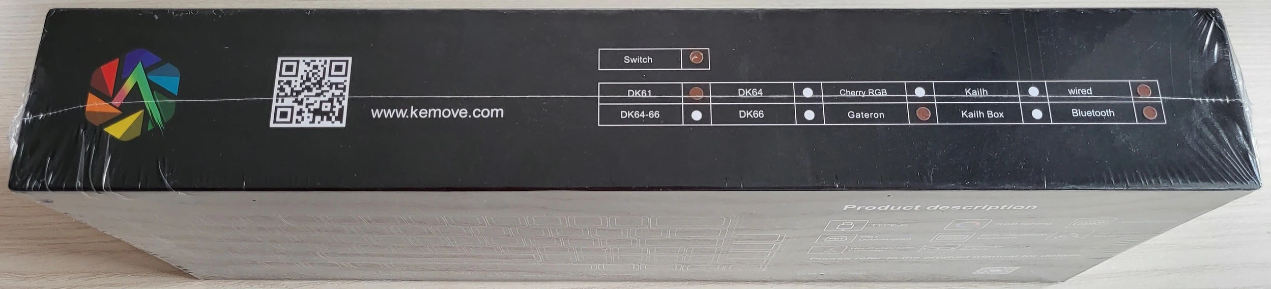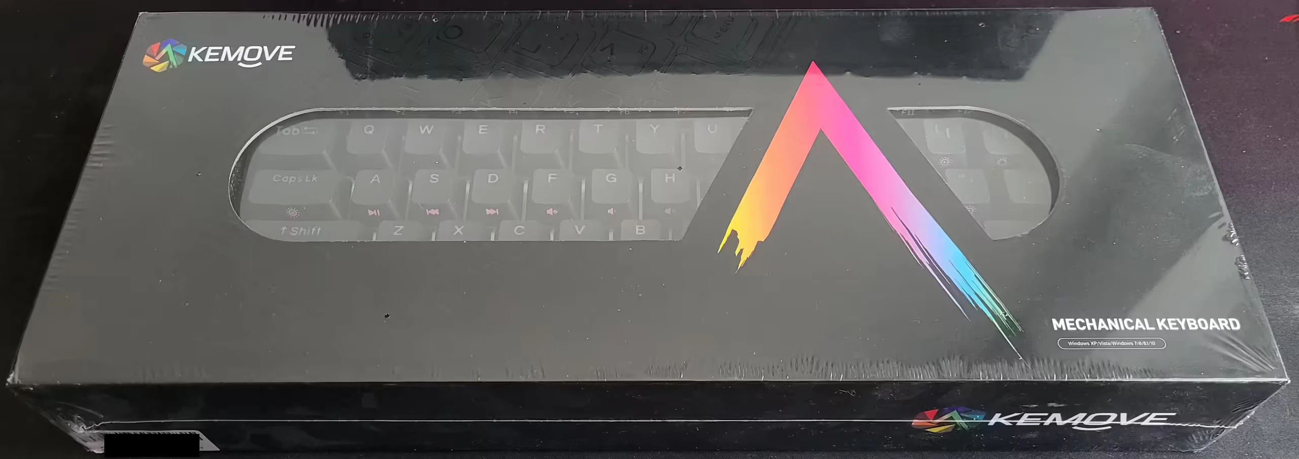 La caja del KEMOVE muestra el logotipo de la marca en la parte delantera y y se compone de una ventana que con el protector de plástico del teclado deja ver una parte del él, tiene una serigrafía con relieve únicamente por motivos estéticos pero que indica que hasta la caja está cuidada.