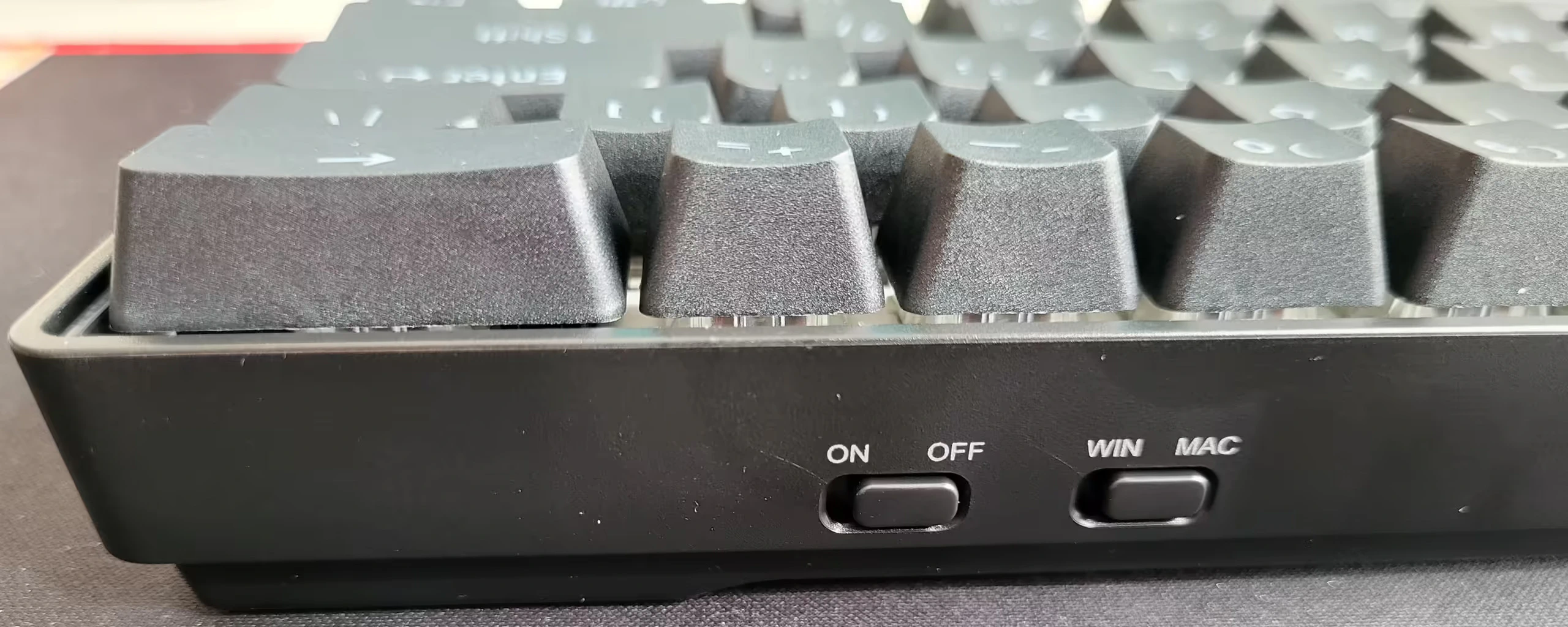 El cuerpo del teclado es completamente de plástico que da sensación de resistente con un pequeño biselado en la parte delantera. En gran medida tiene el mismo aspecto de los DIERYA y es que el teclado tampoco necesitaba ninguna mejora adicional. Las diferencias están en la parte trasera que incluye el nombre de la marca y las patas que permite regular la altura al menos en una posición cosa de las que carecían los DIERYA. Por otro lado en este KEMOVE tiene dos interruptores que están en el lateral para activar el modo inalámbrico y cambiar el modo de compatibilidad entre Windows y macOS.
