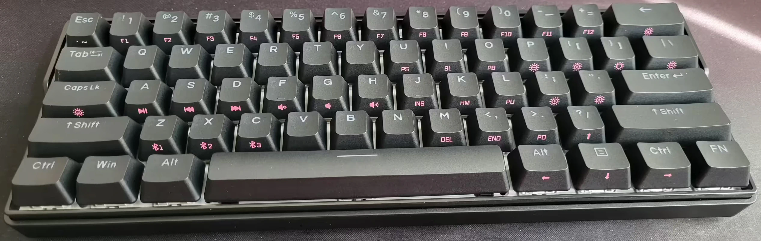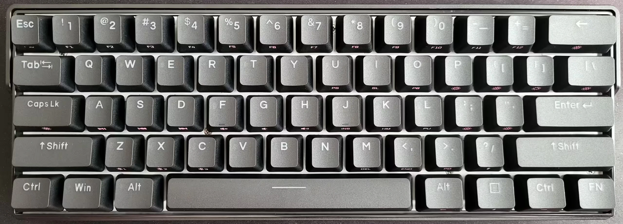 Al ser un teclado compacto hay que considerar que algunas teclas han de usarse como una combinación, hasta acostumbrarse puede resultar incómodo. También hay que tener en cuenta que es un teclado con disposición ANSI que es diferente de la habitual en España que es ISO, tiene algunas diferencias en los tamaños de algunas teclas como la tecla Return. En caso de querer keycaps con serigrafía de teclado en Español hay que comprarlas aparte, en AliExpress hay unos keycaps con disposición en Español que usa mucha gente.