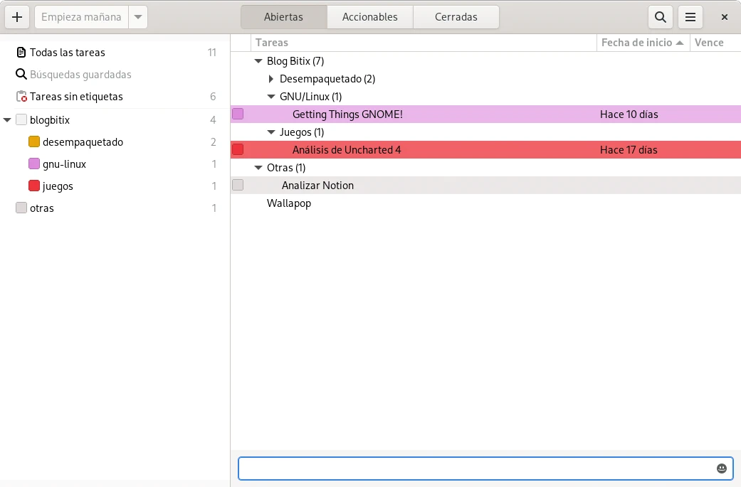 La aplicación Getting Things GNOME! es una aplicación de escritorio que ofrece la funcionalidad para gestionar listas de tareas, esto permite registrarlas, priorizarlas y tener el registro para centrarse en cada momento en las más prioritarias y más importantes. Esto permite aumentar la productividad y que el cambio de contexto de tarea sea más fácil.