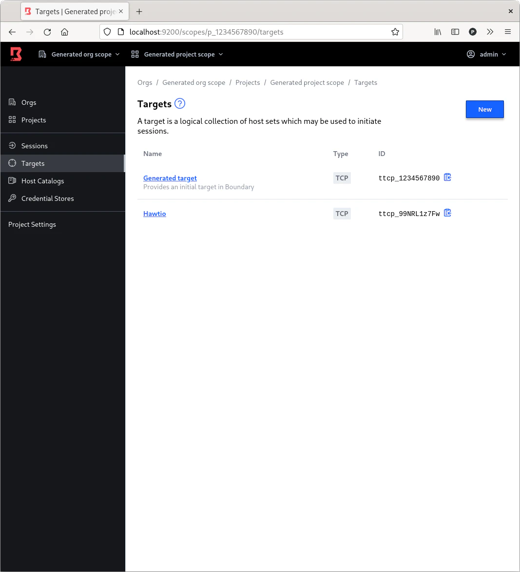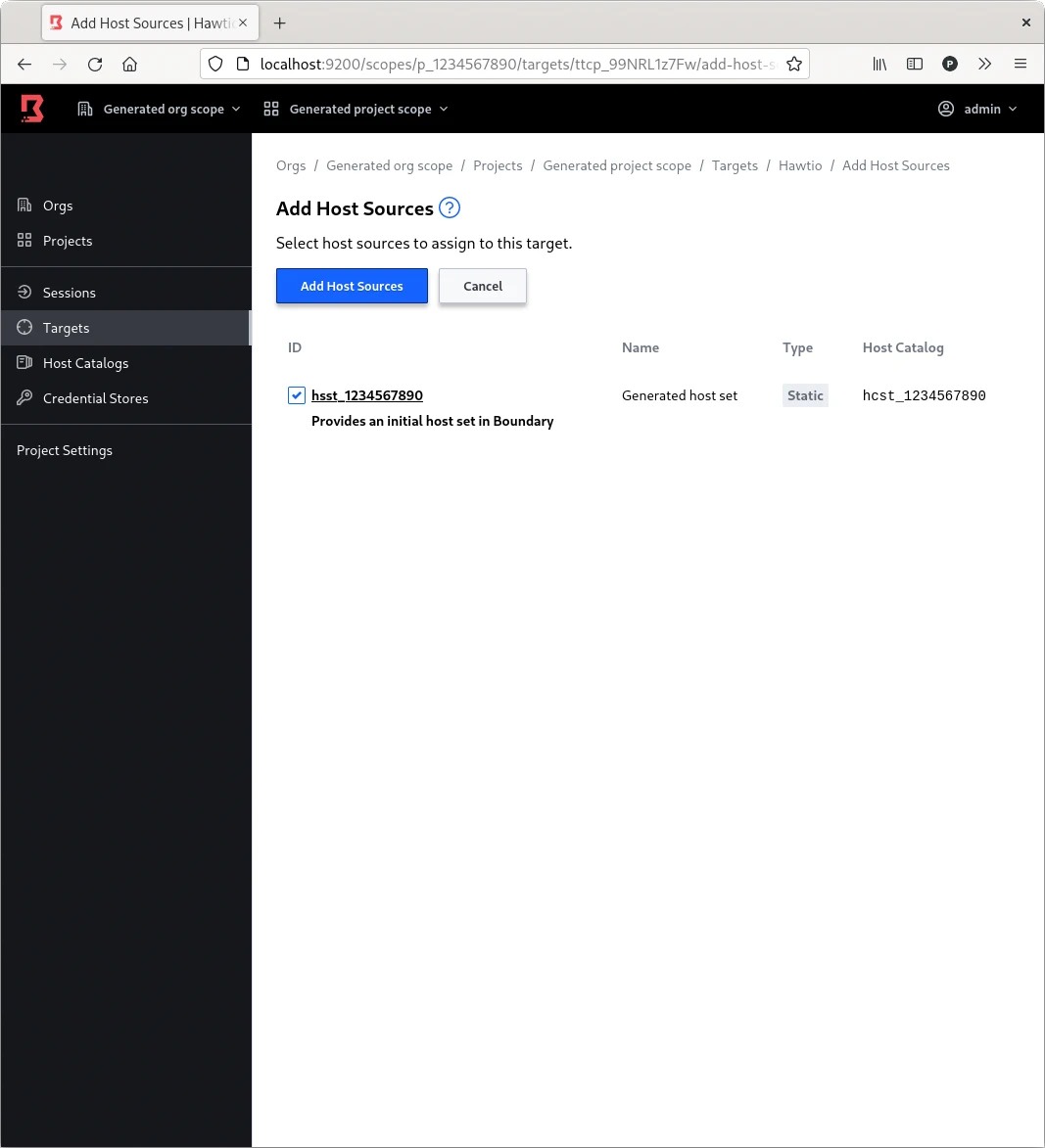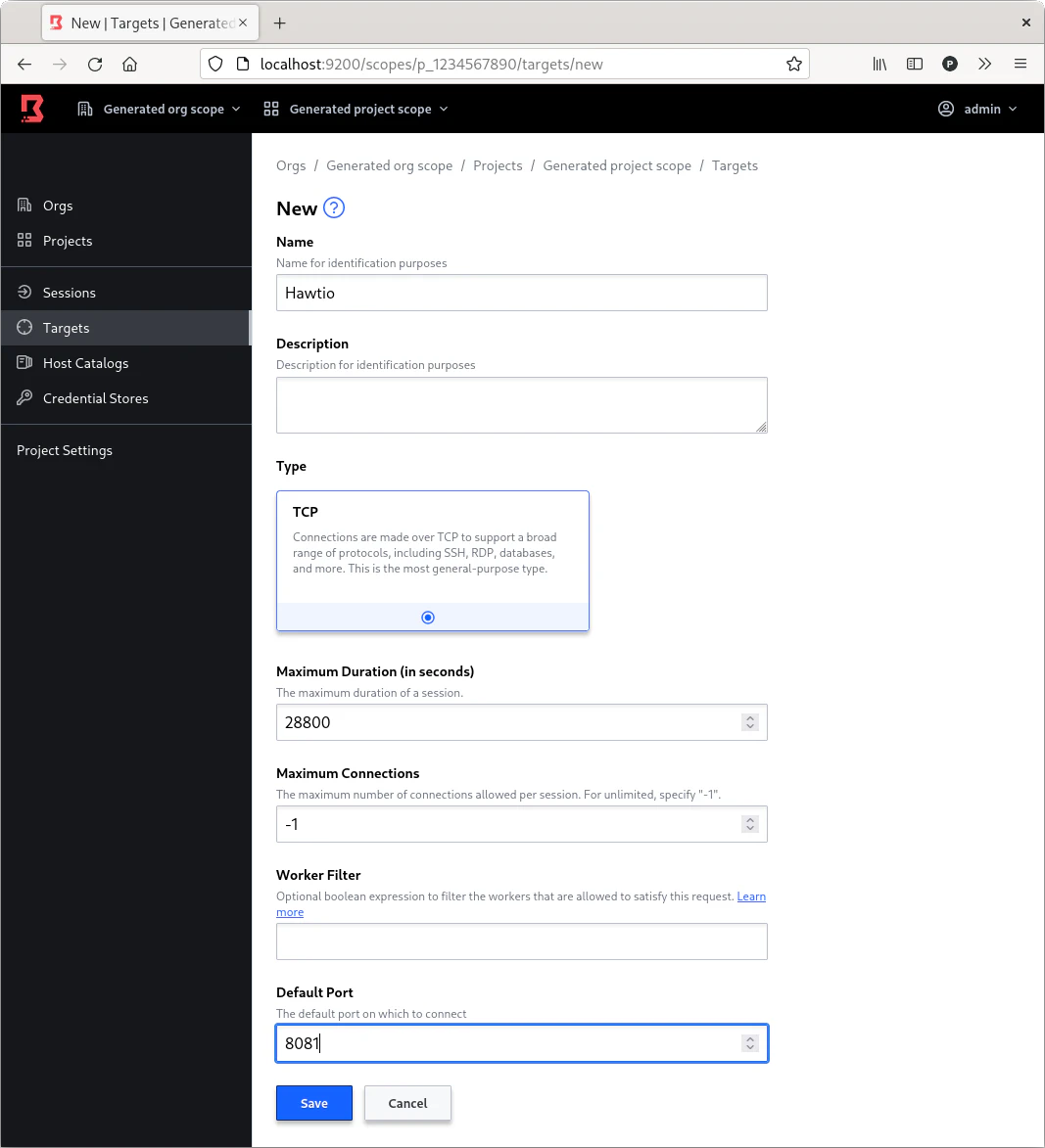 Por defecto Boundary en el modo desarrollo crea una definición del host local y un target al puerto 22 de la máquina local. Dado que Hawtio seguramente esté en otros puertos, en el ejemplo en el puerto 8081 es necesario crear un target y añadir el host para la máquina local que permita la conexión a ese puerto.