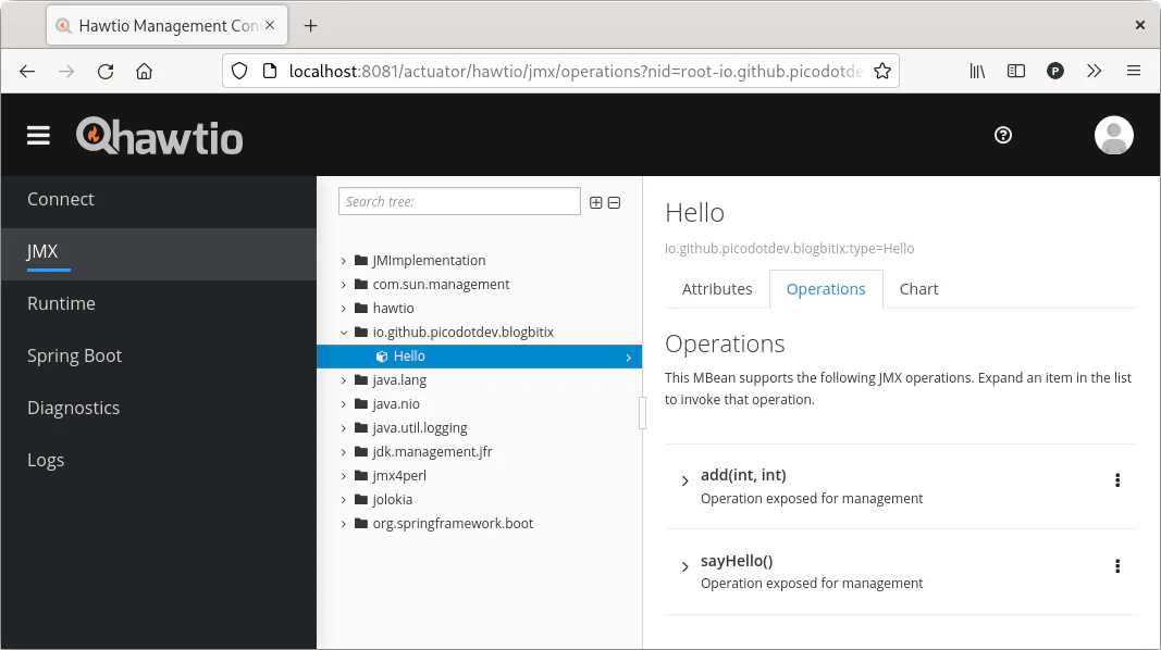 El proyecto Hawtio proporciona una interfaz web en la que poder ver, obtener datos e invocar las operaciones ofrecidas por los MBeans registrados en el contenedor de JMX, los propios de la aplicación y muchos otros que proporciona Java y en el caso de utilizarlo Spring Boot.
