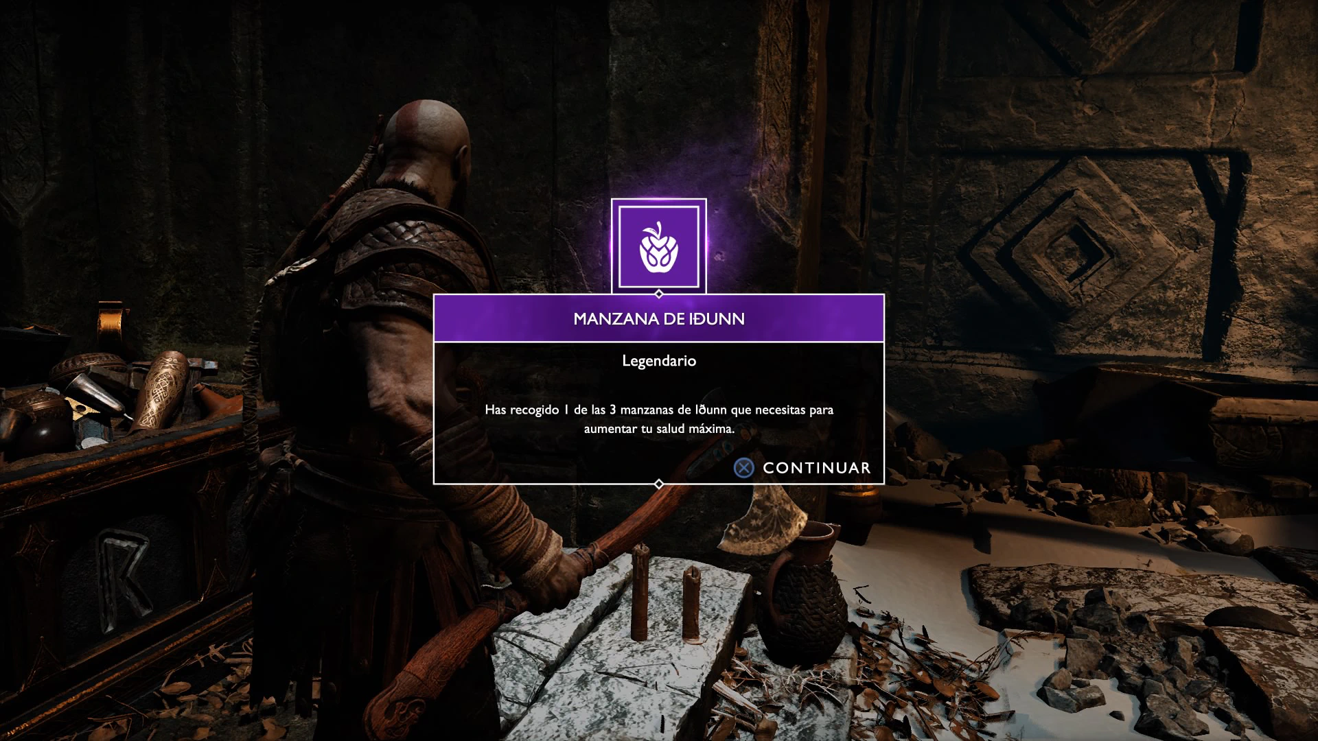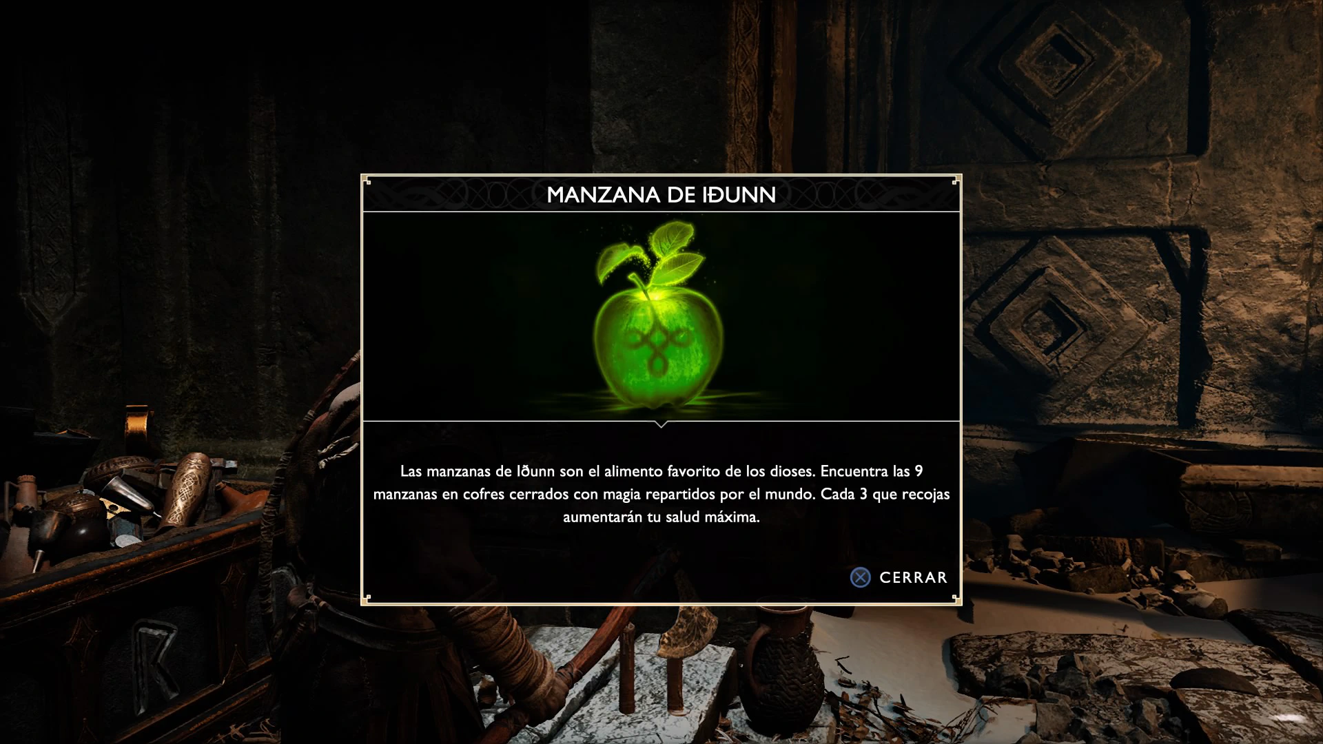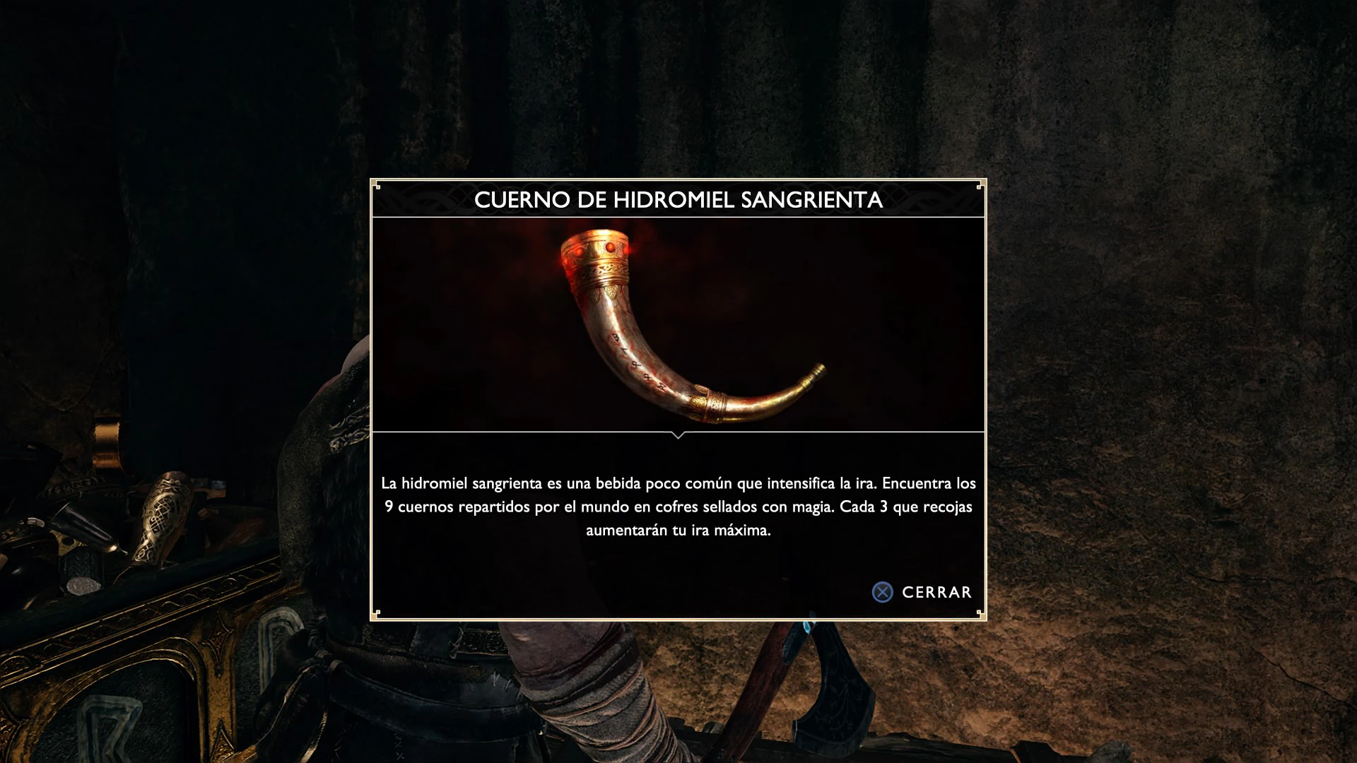 Otros objetos destacados son las manzanas de Iddum y cuernos de hidromiel sangrienta que permiten aumentar la cantidad de vida e ira de Kratos. Las manzanas y cuernos se consiguen abriendo cofres legendarios que tiene un candado que para abrirlo requiere resolver encontrar y romper varias runas, resolver un pequeño puzzle o encontrar y hacer sonar tres campanas en una pequeña fracción de tiempo lo que requiere un poco de habilidad.